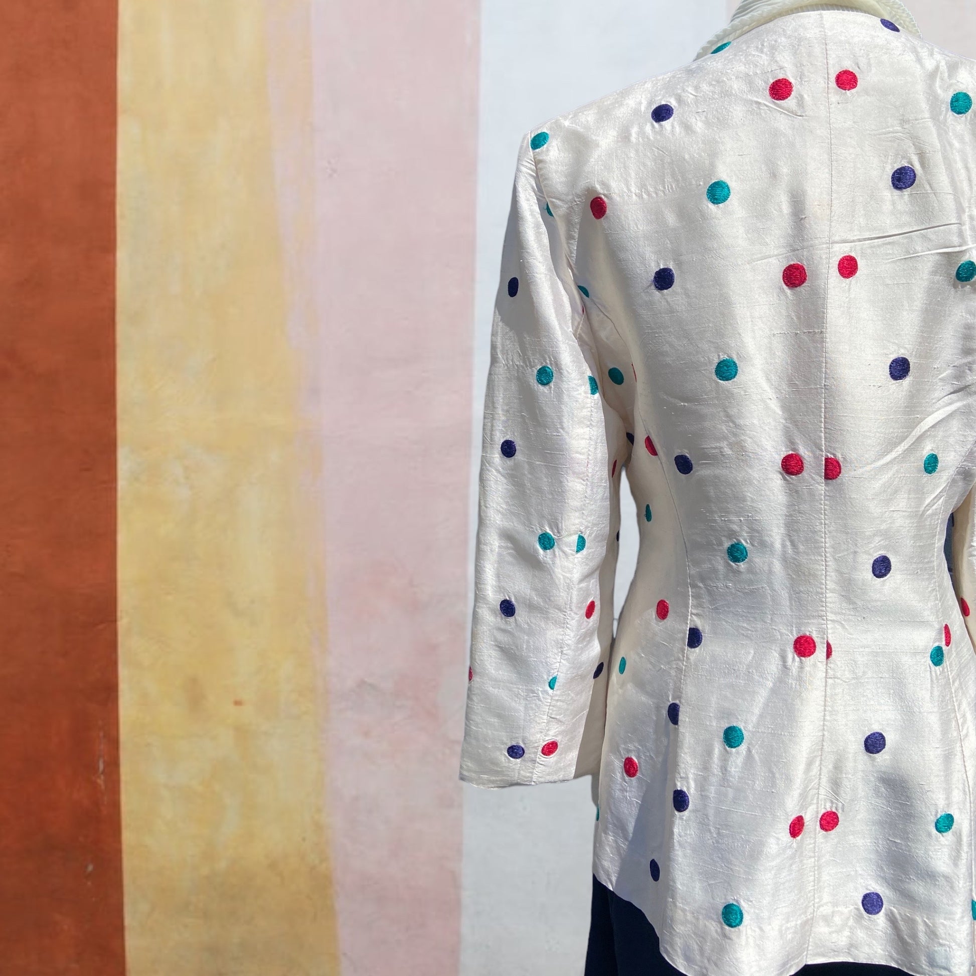 80's era silk blazer, full of fun and covered in polka dots. the blazer is fully linned and is a single button cross over style front.