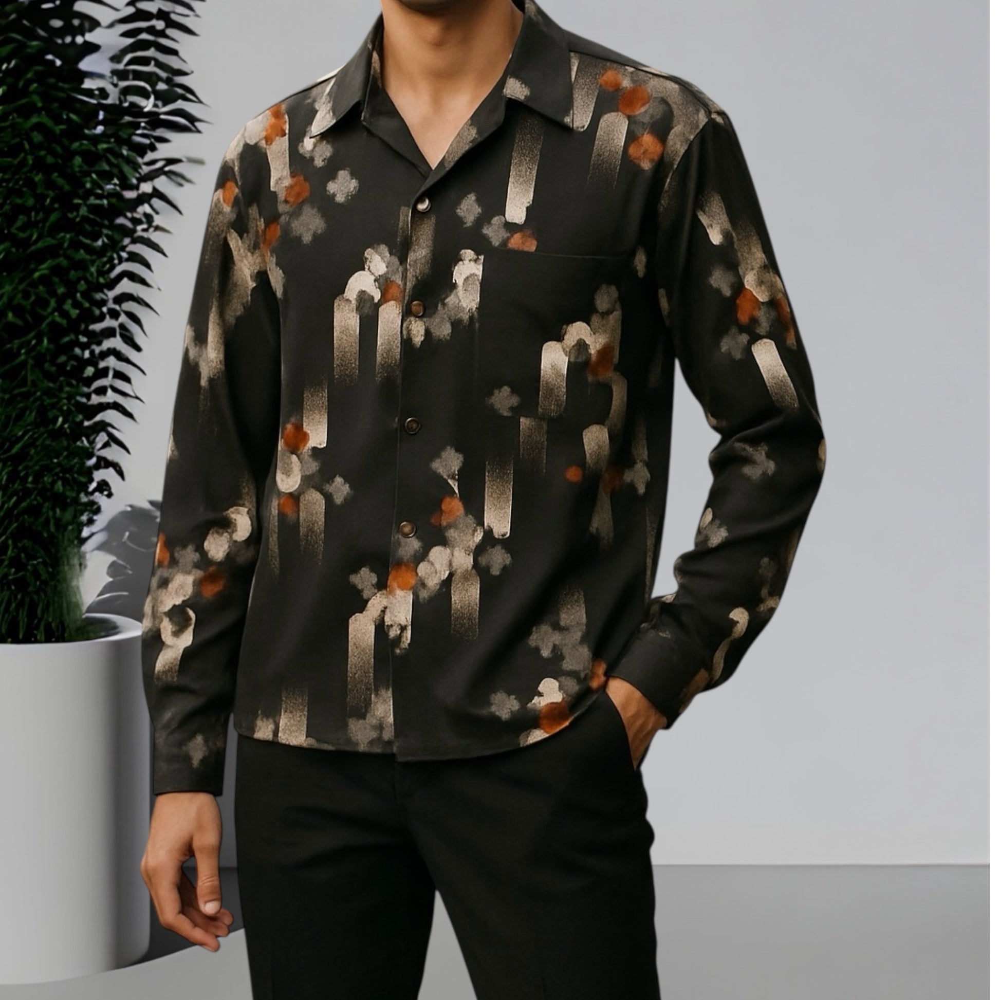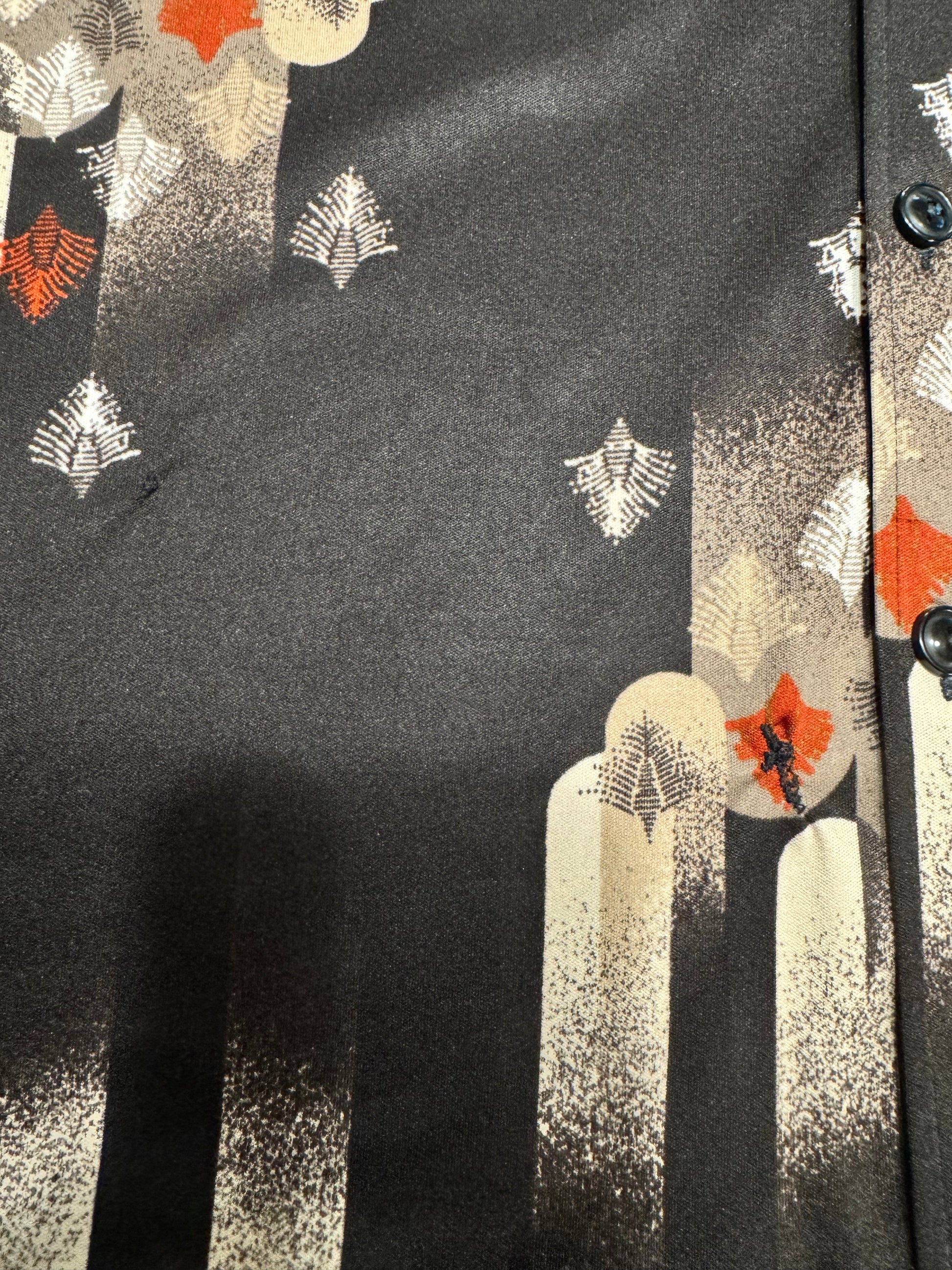 This Made in New Zealand 70’s shirt features abstract patterns in silver, white, beige and rusty red.