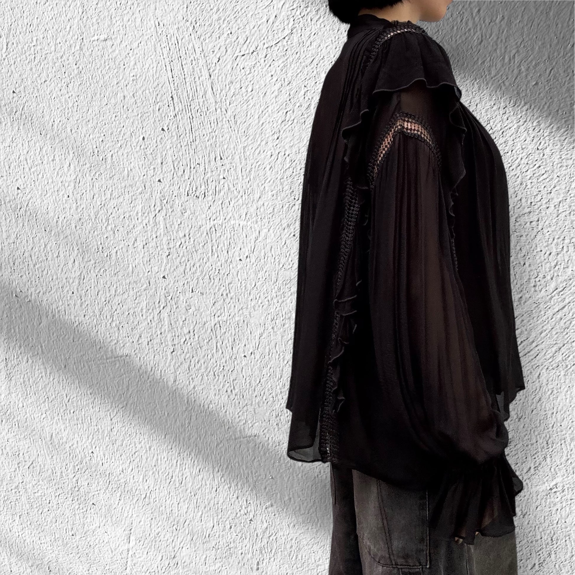 This is a black, long-sleeve blouse made from a lightweight, semi-sheer fabric with a soft, A-line, flowy drape with a slightly oversized and relaxed fit.