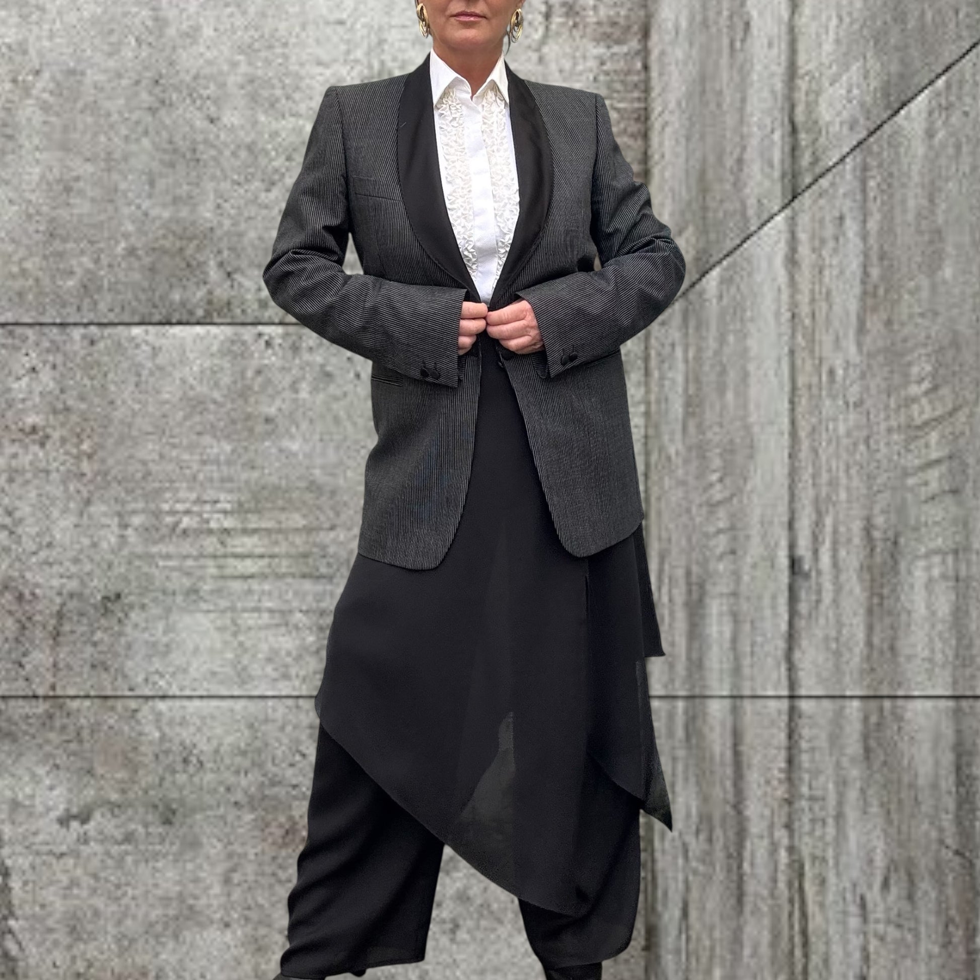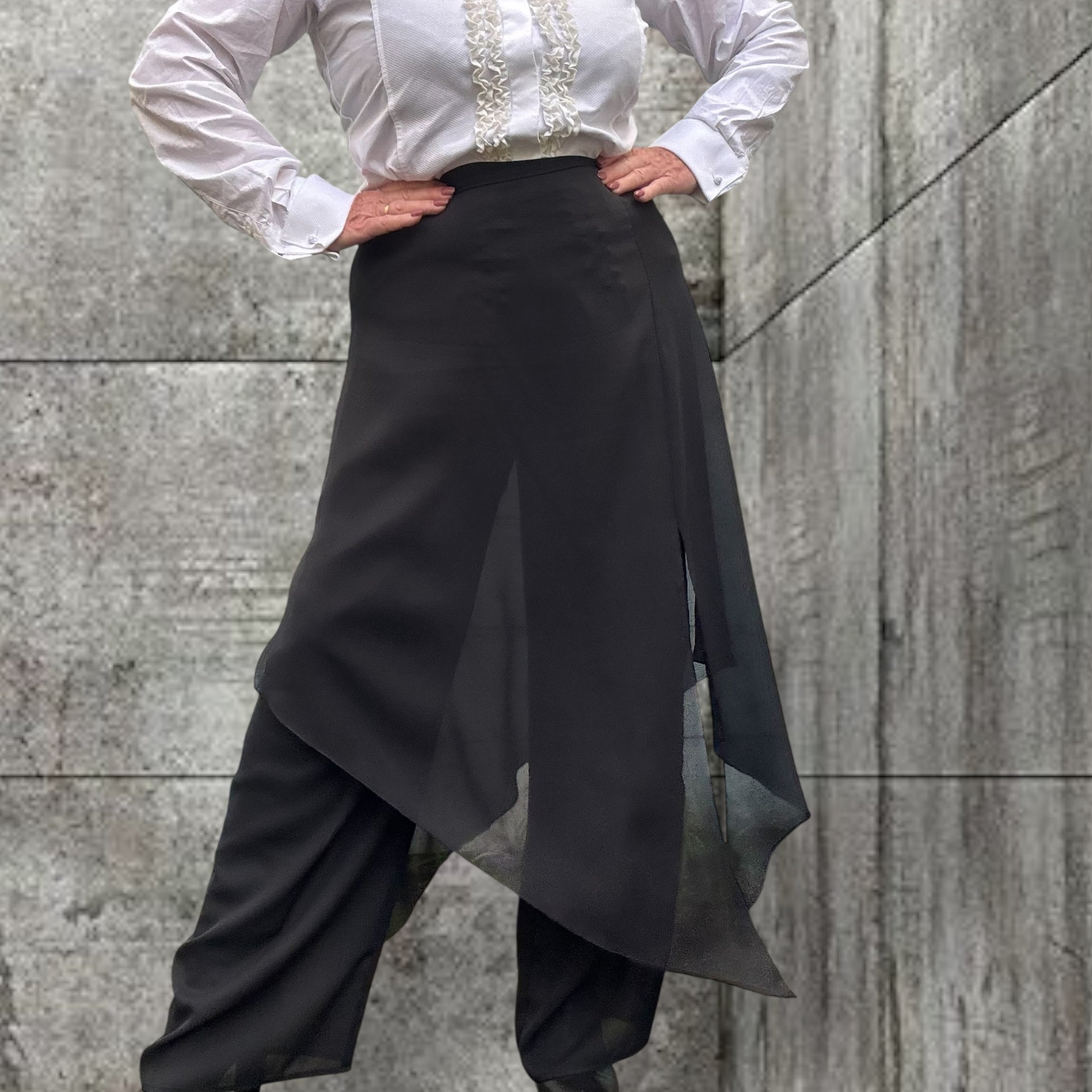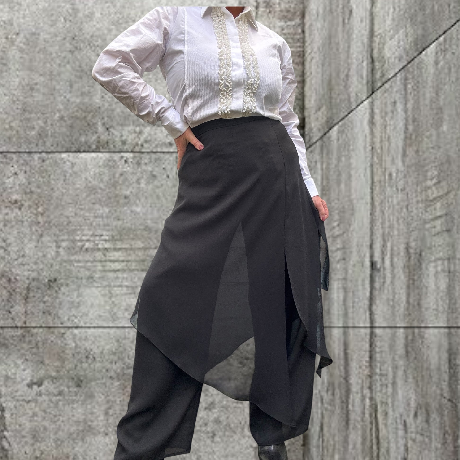 Cut like a classic straight leg pant on a flat front with an over layer of chiffon cut on different angles .
