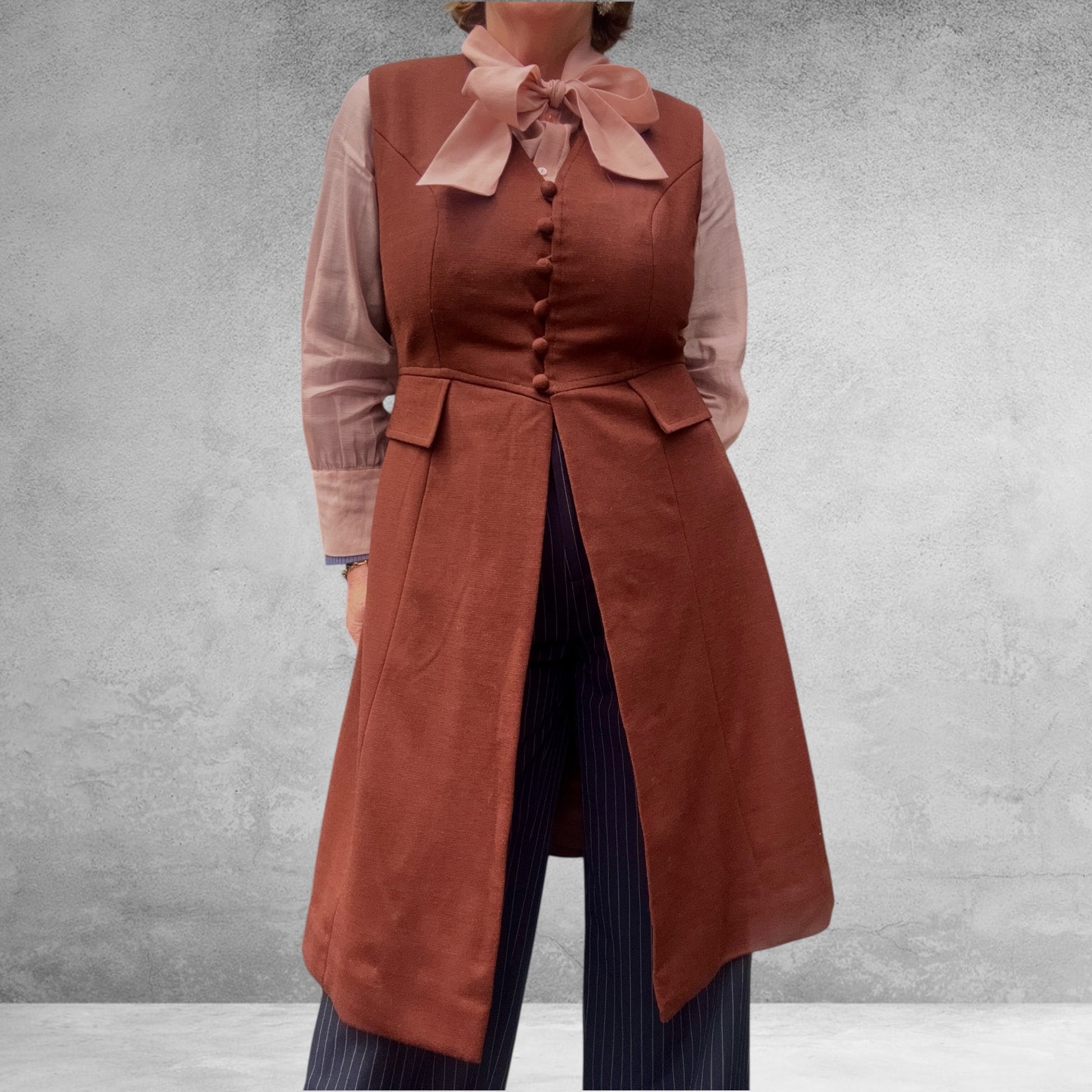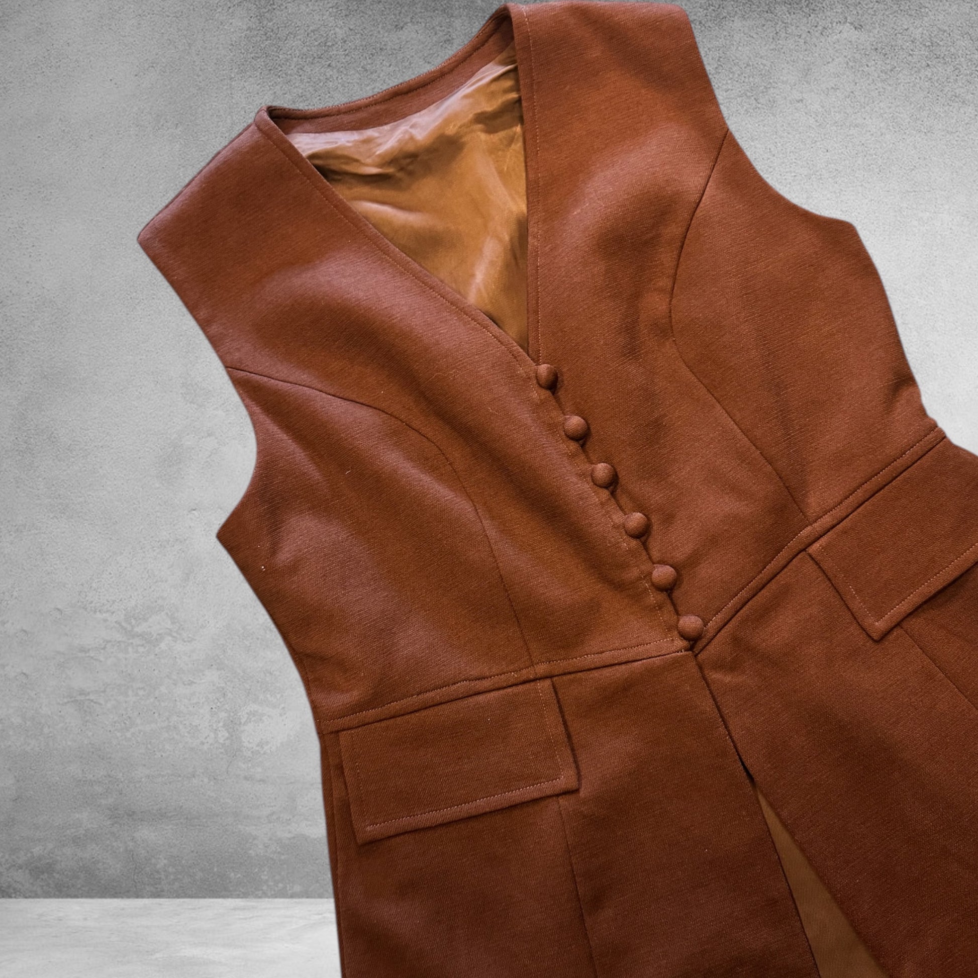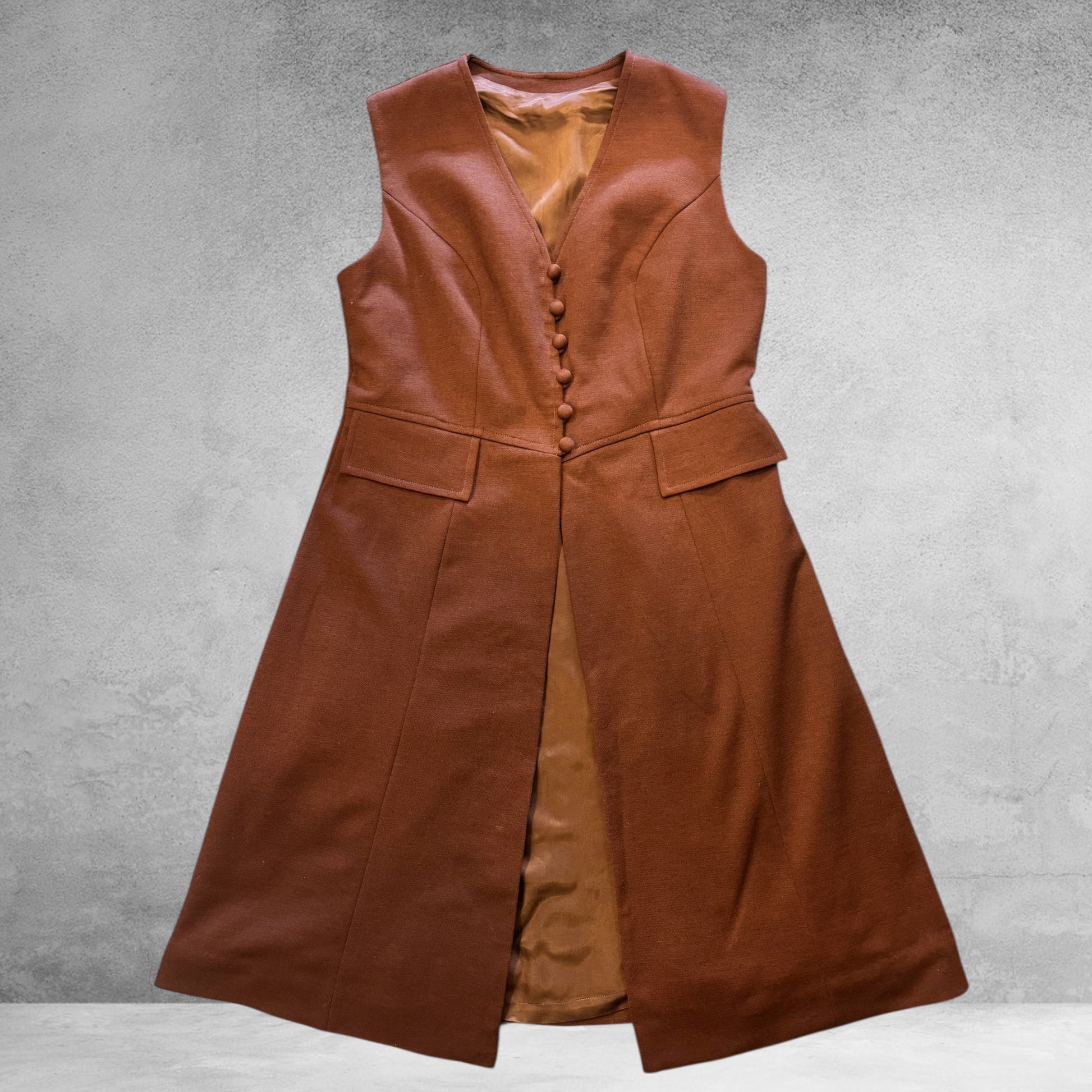 A super stylish long line 1970’s wool jersey Gillette in a rich chocolate brown.