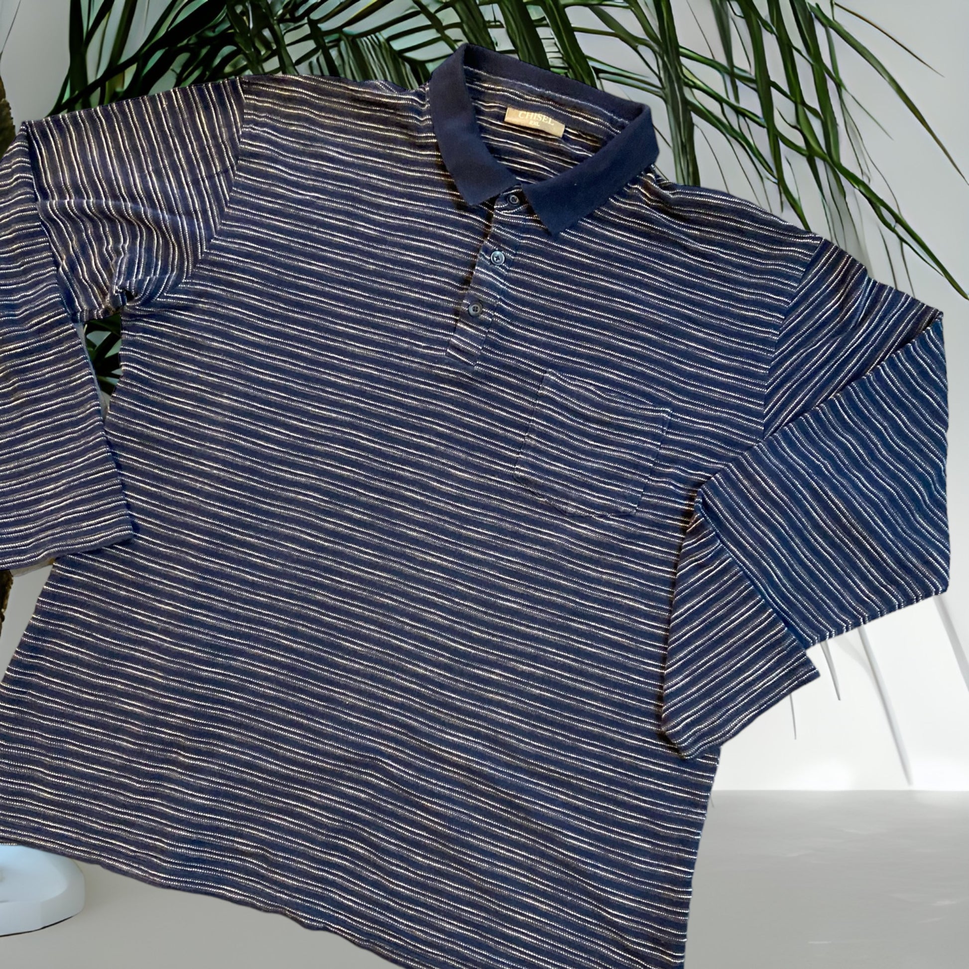 classic navy blue cotton polo shirt with long sleeves and a a chest pocket. the shirt features and double line pencil strip running horizontally across the front and back of the shirt as well as the sleeves
