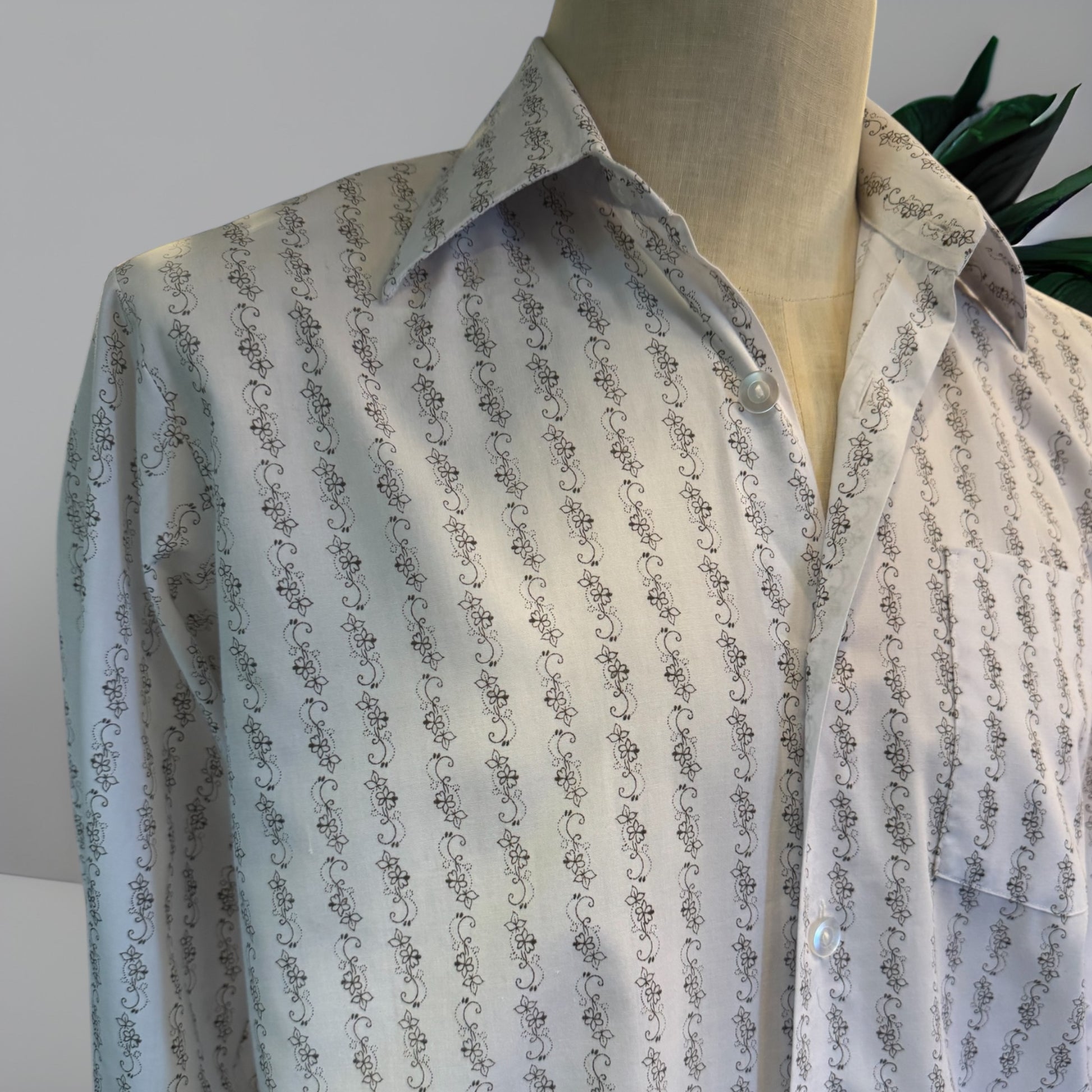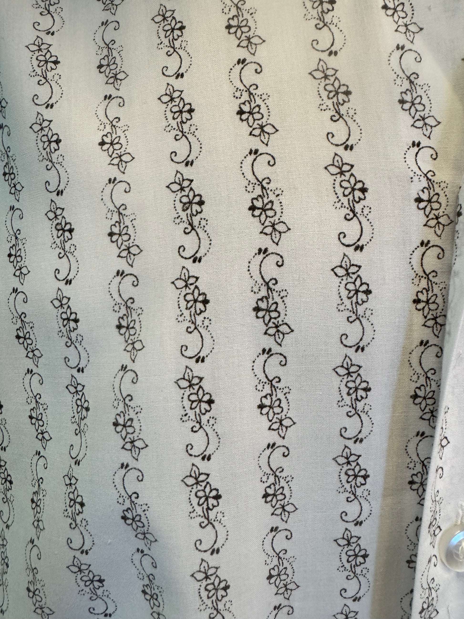 The print is a small floral on a white background a super wearable shirt with a subtle vintage feel.