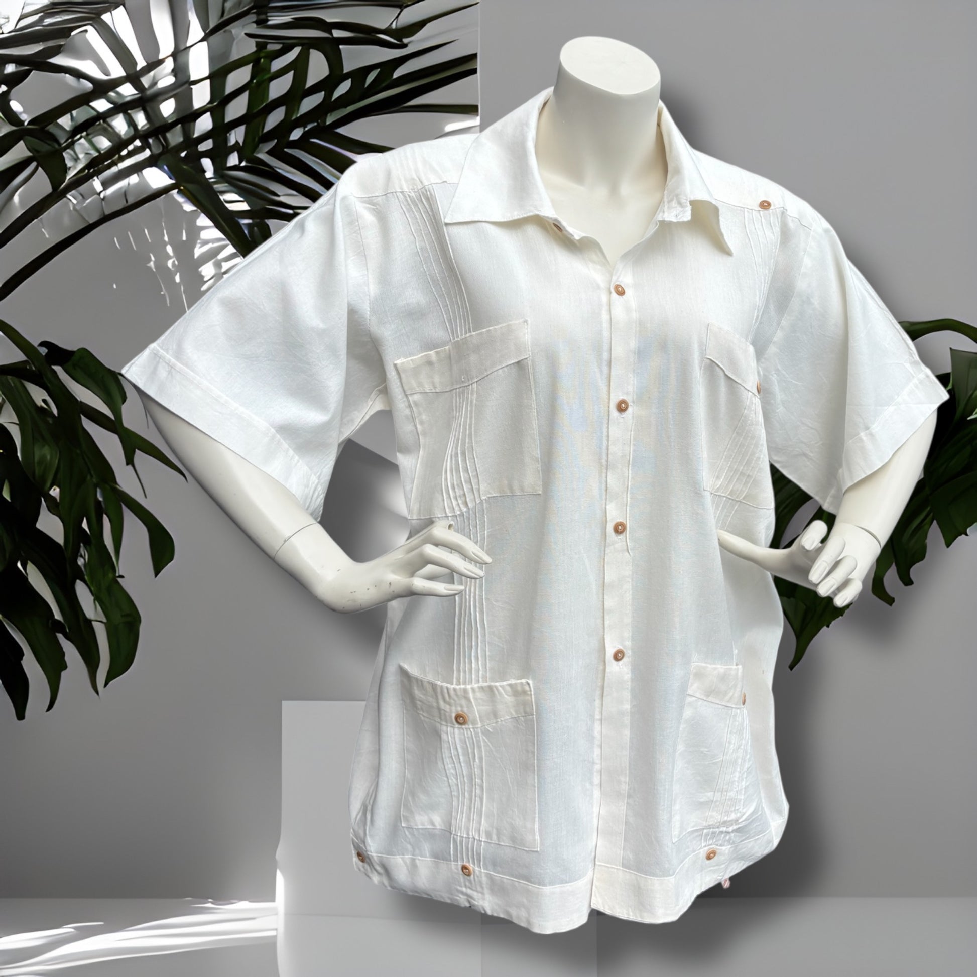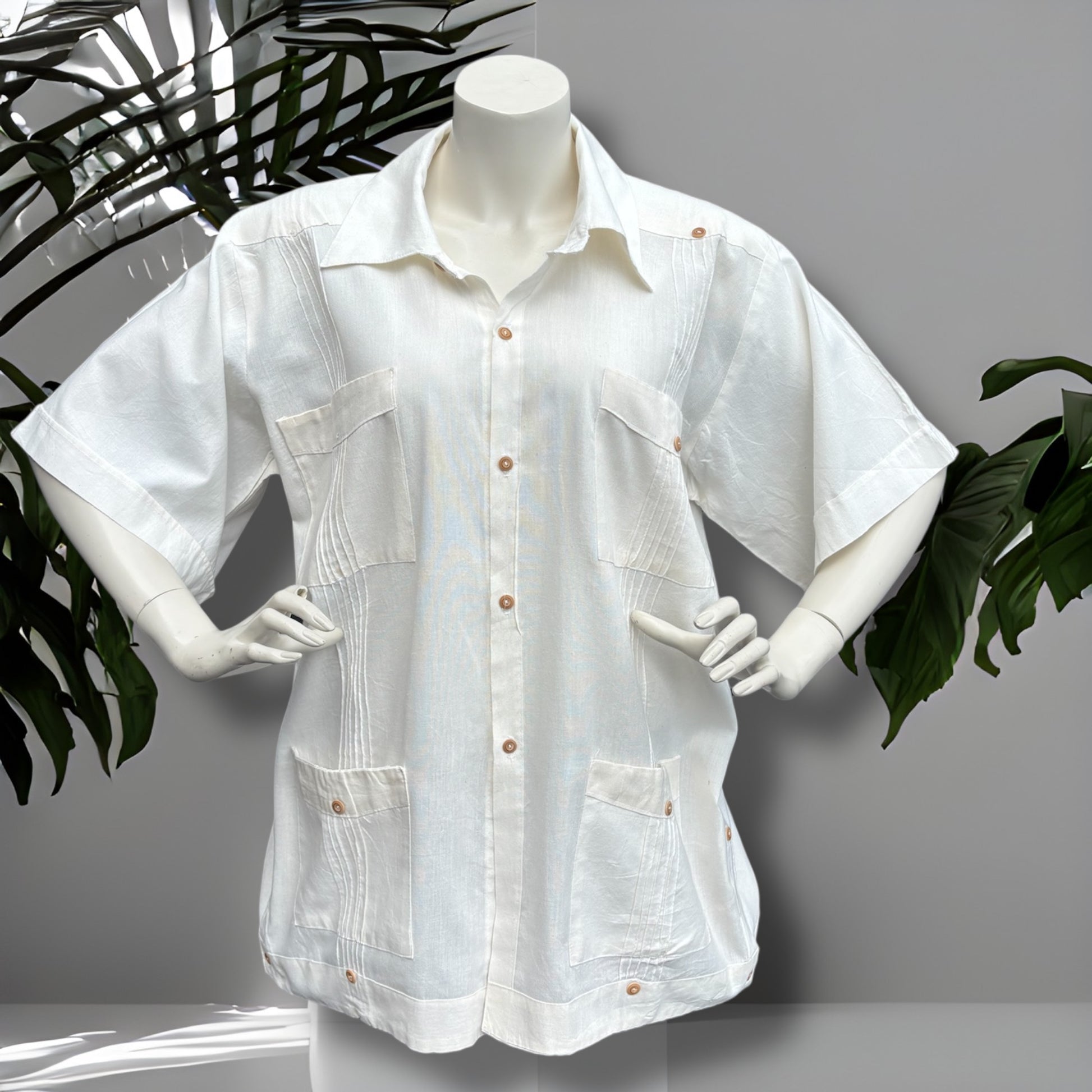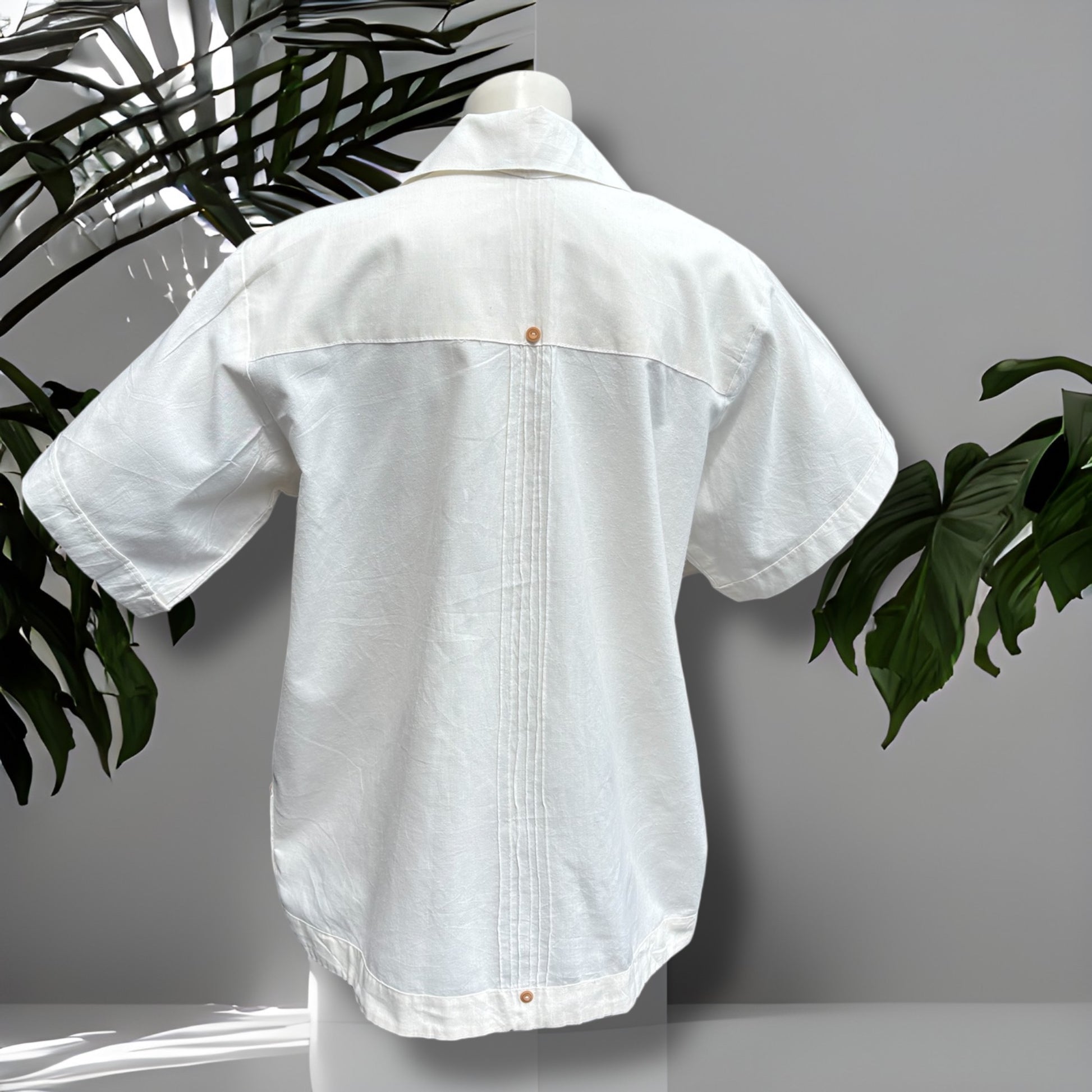 This lightweight, off-white short sleeve Cuban button up shirt has a relaxed, boxy fit made of a woven, slightly textured fabric.