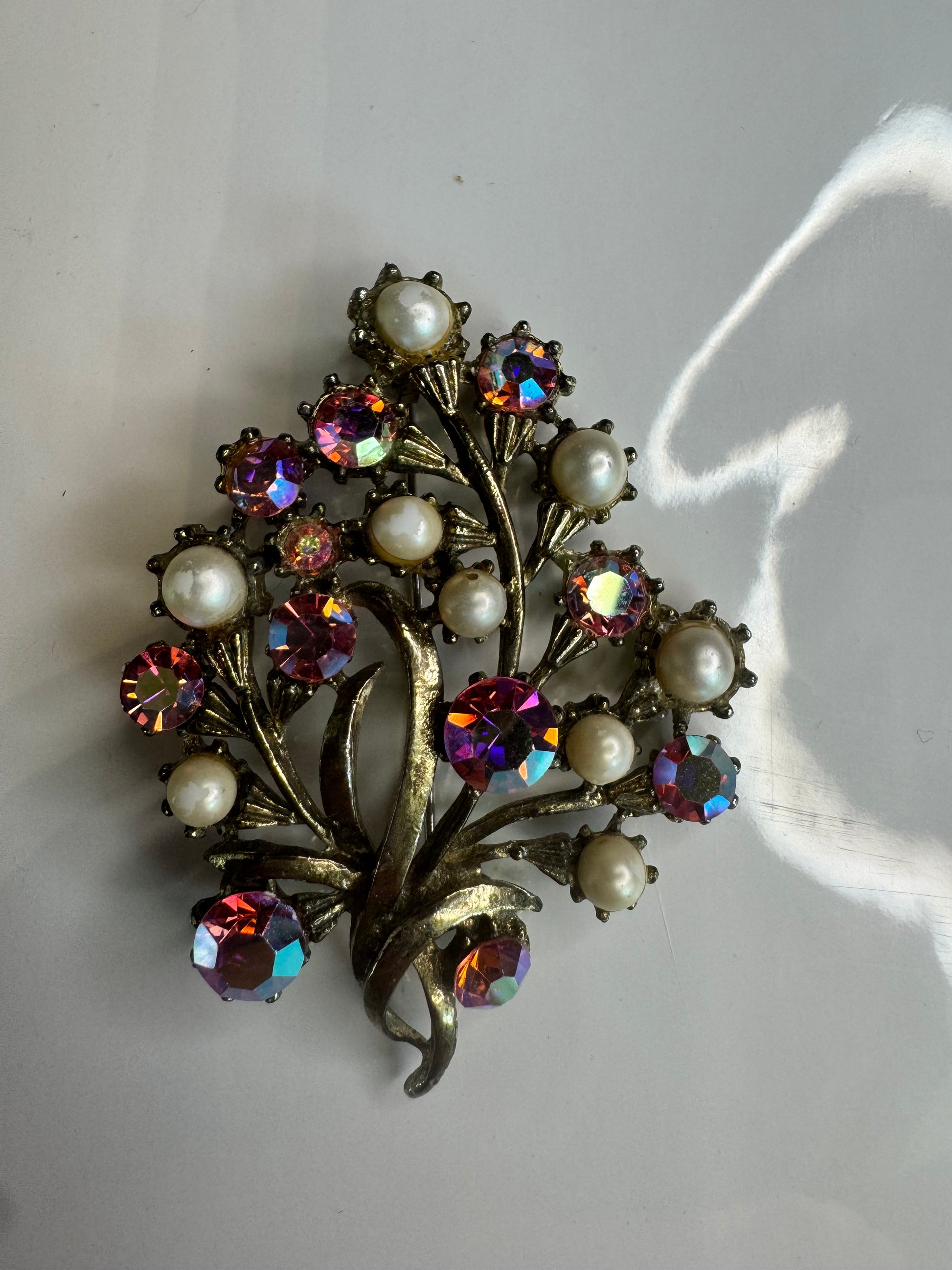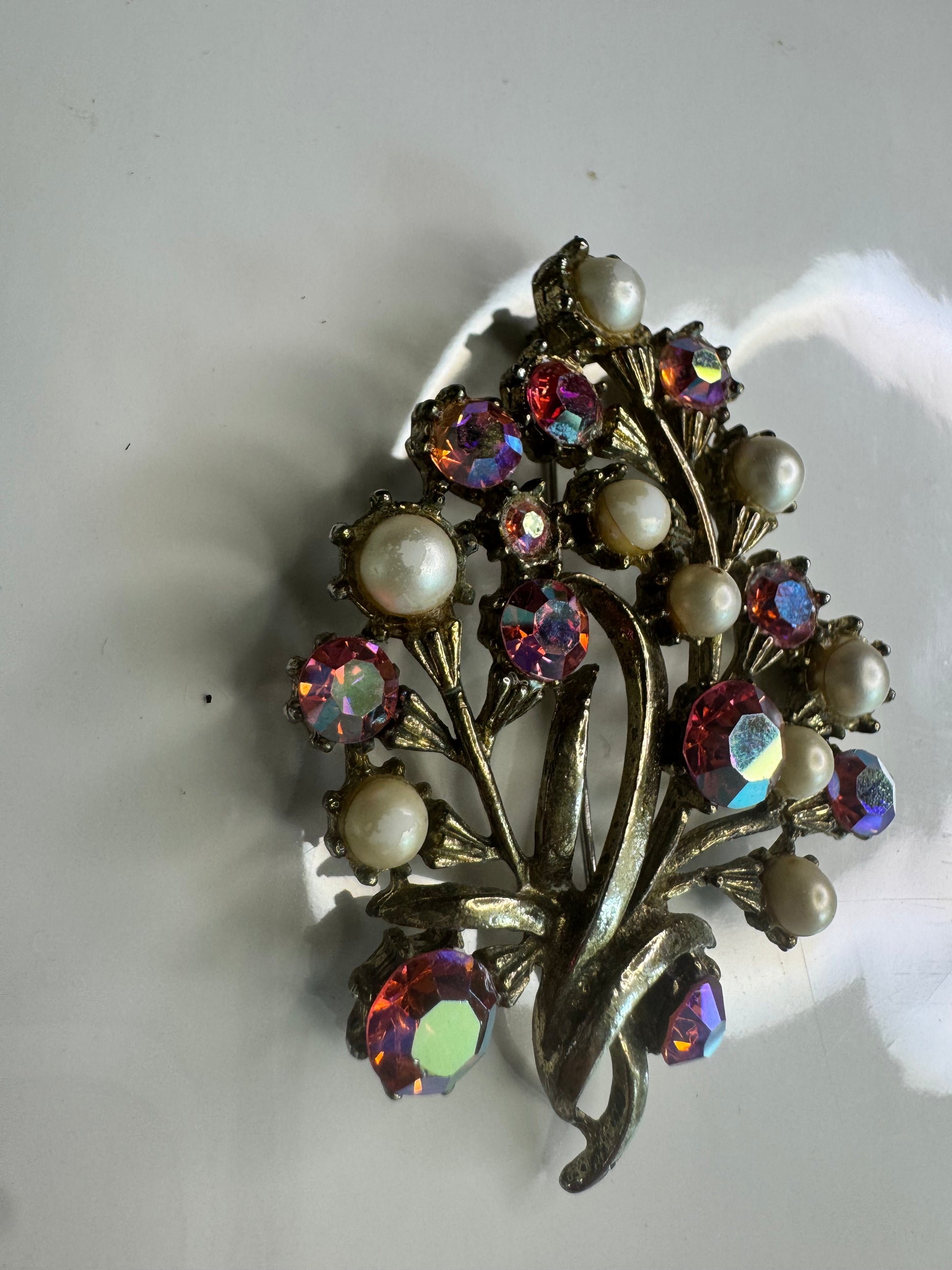 This beautiful large vintage brooch is from the late 50’s early 60’s the style is a floral bouquet incorporating faux pearls and pink iridescent Aurora borealis crystals.