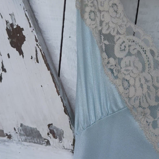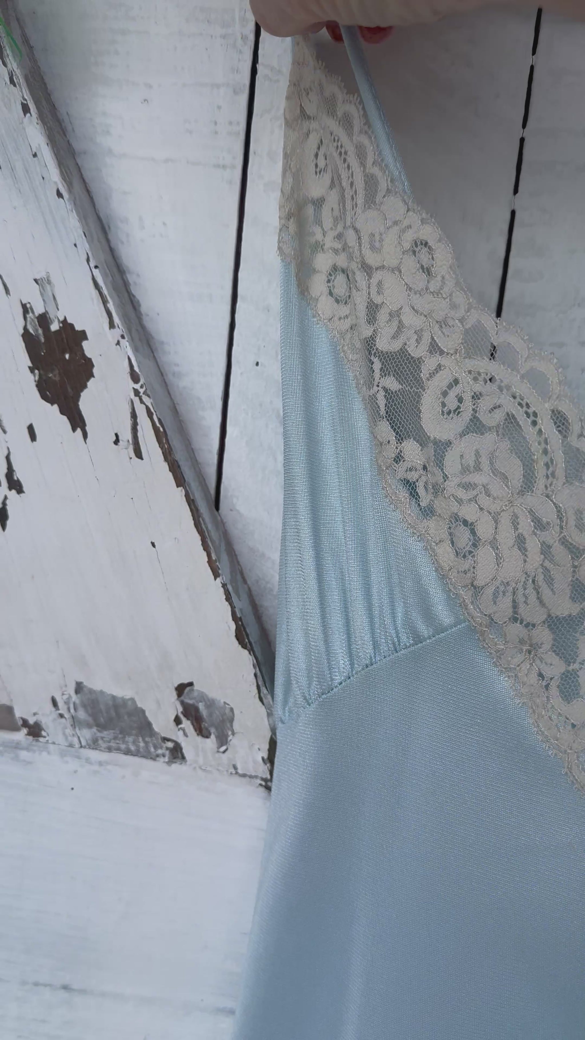 A simply gorgeous soft power blue slinky 70’s slip with a deep lace front, spaghetti straps and a back tie for shape .