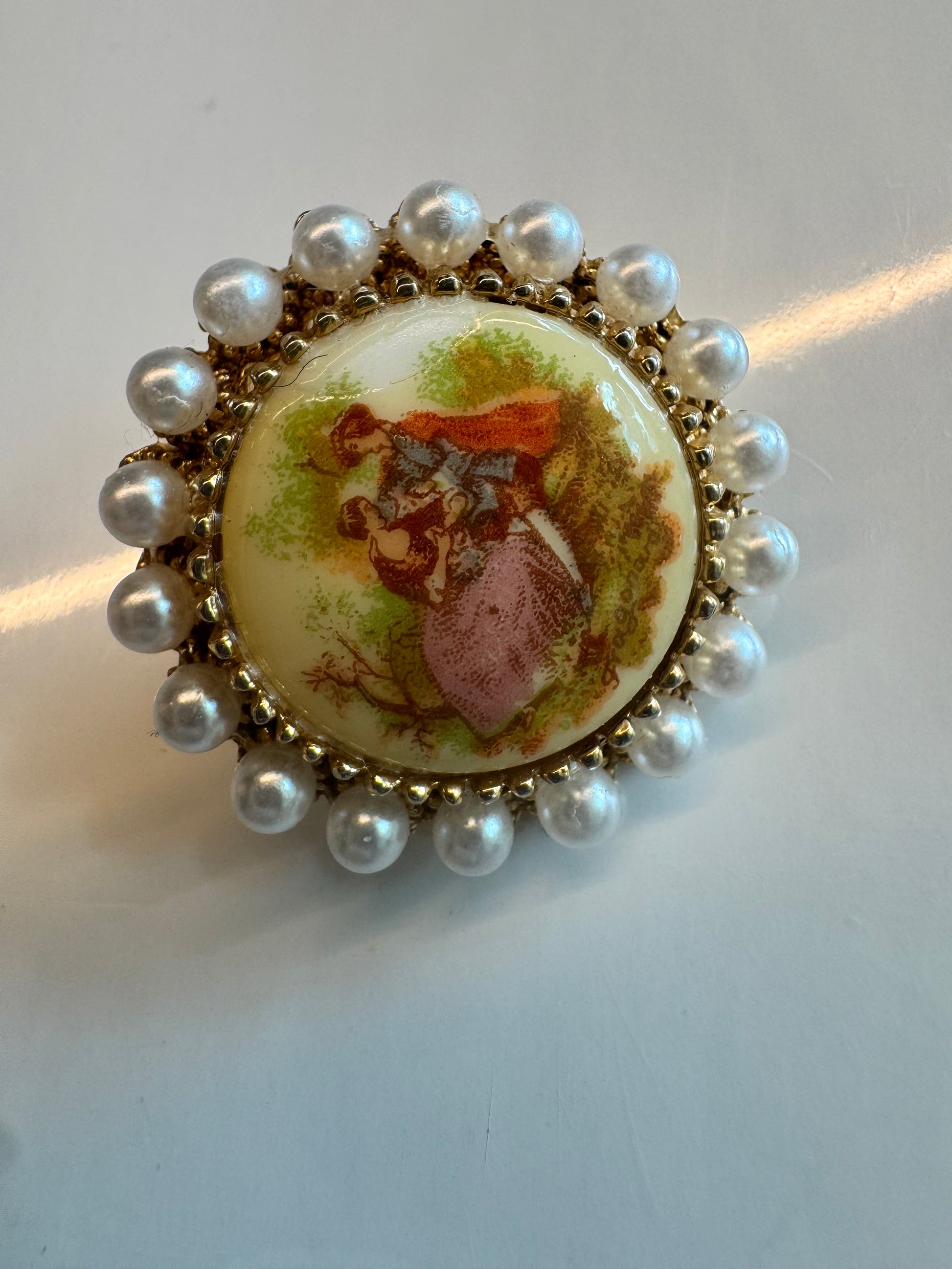 The brooch features a circular, domed cabochon depicting a vintage scene.