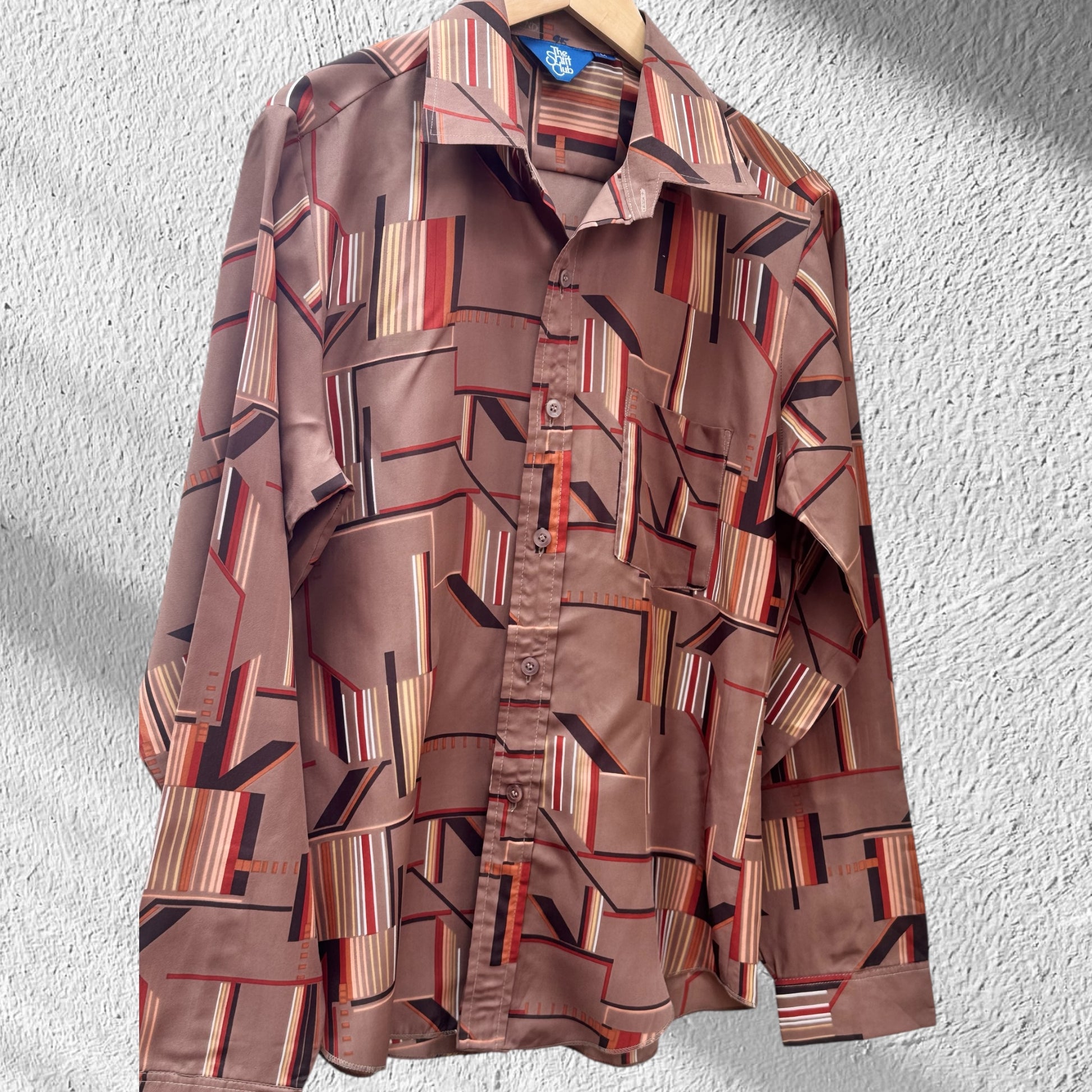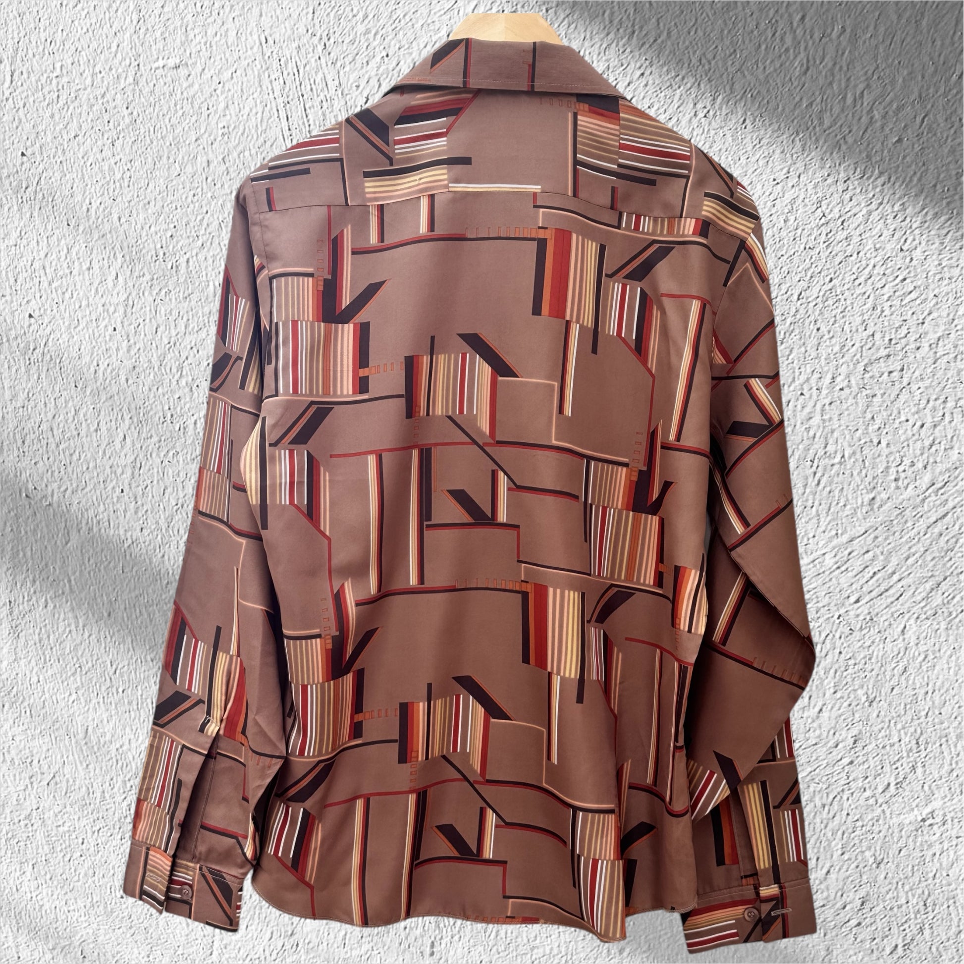 This is a late 70’s disco style shirt in a light weight slinky no stretch polyester.