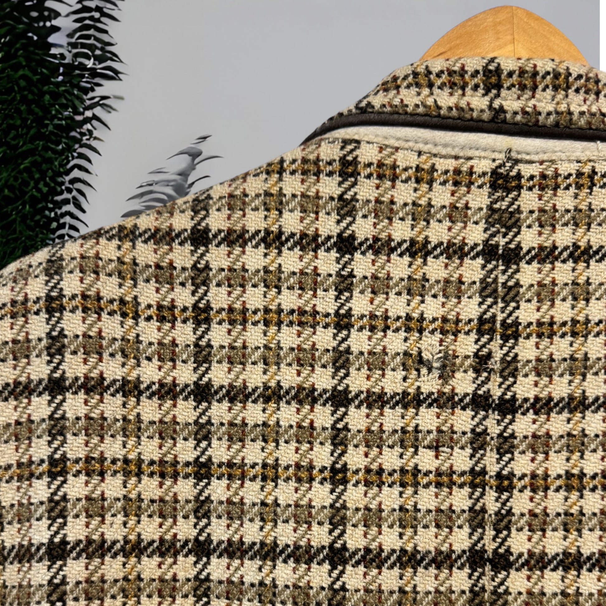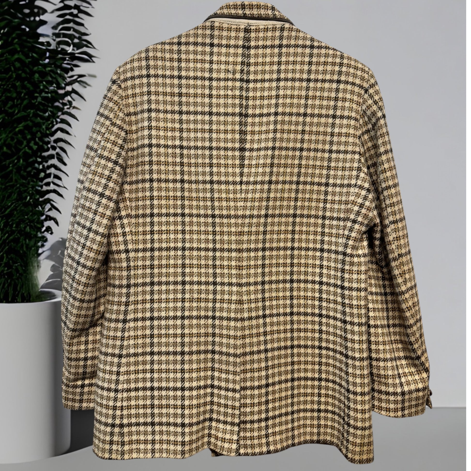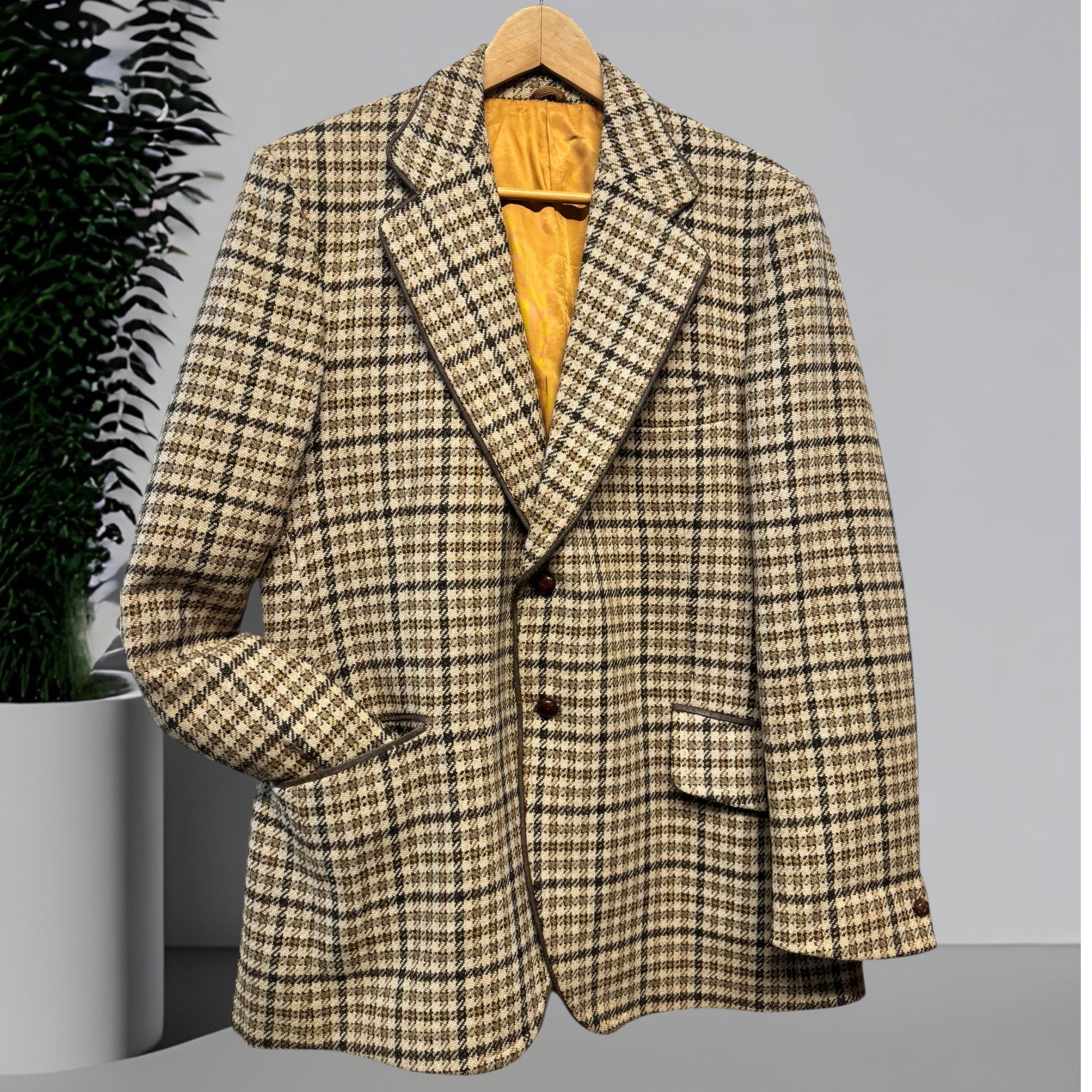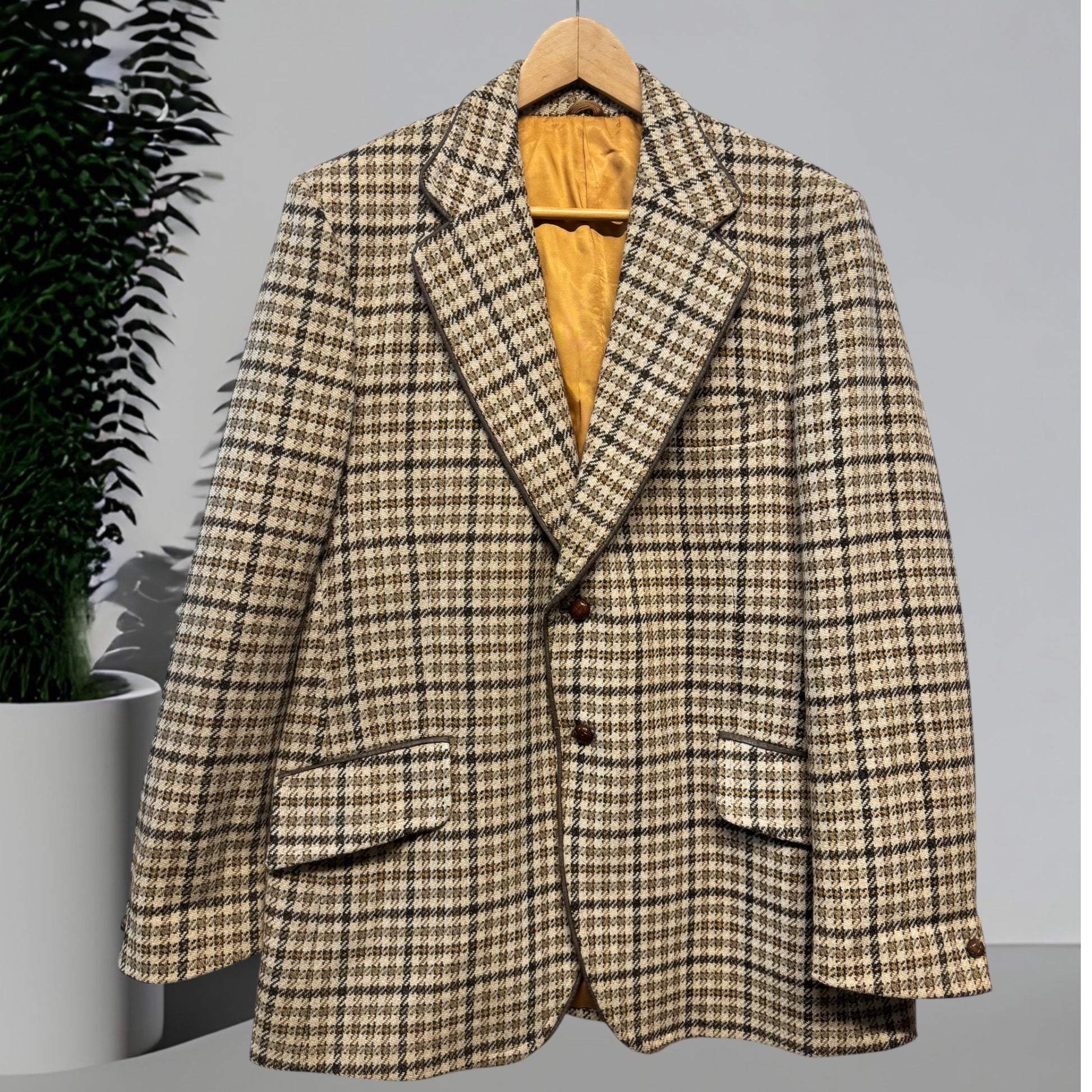 This warm toned, 70’s houndstooth patterned blazer/ sports coat is made from a soft wool blend with dark trimming along the edges for a sharp, tailored look. With a two button front, notched lapels, two flap pockets and a breast pocket, soft shoulder pads, and a satin-like inner lining.