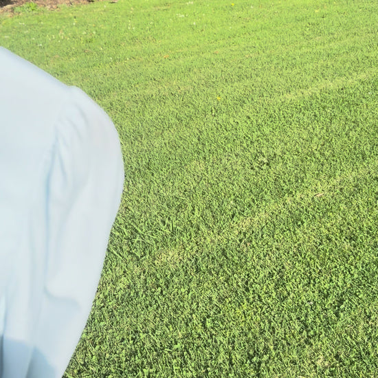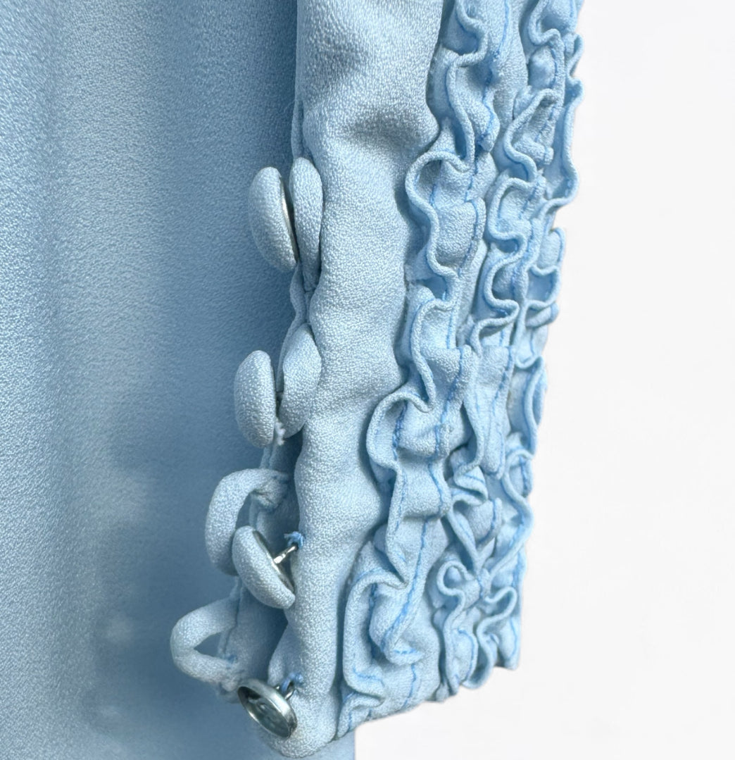 This is the most gorgeous prairie 70’s dress in the softest powder blue decorated in frills on the bodice and hem line and a generous amount in the deep cuffs .