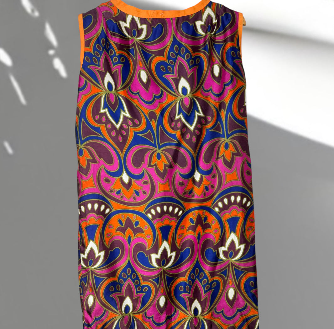 A full bold large paisley print 60’s dress in a simple slip on style that lets the fabric do all the work.