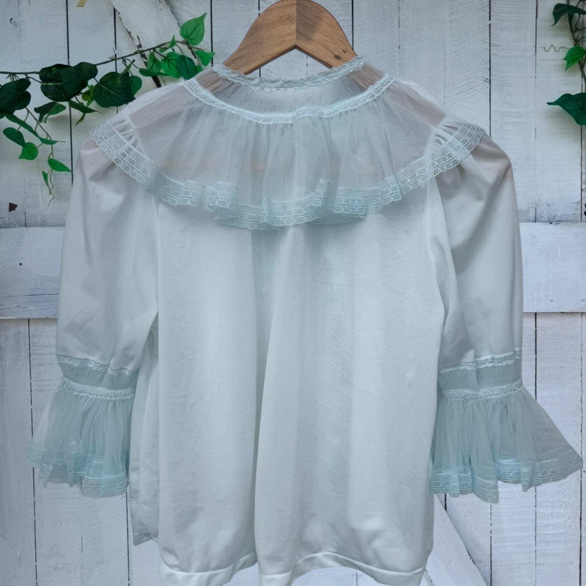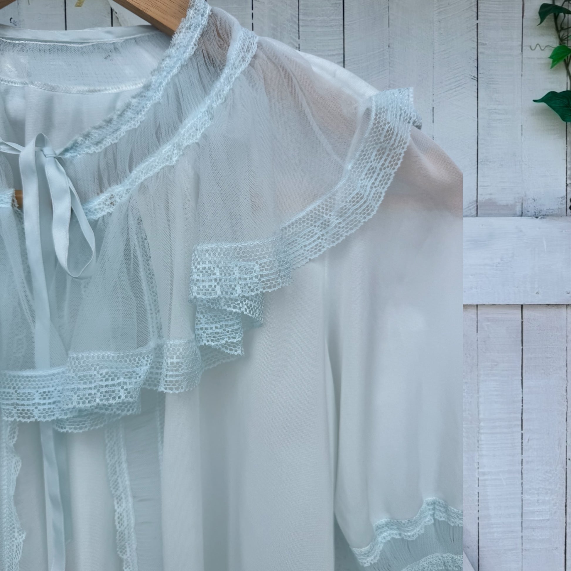 A delish soft powder blue bed jacket from the 50’s / 60’s era with so many beautiful features.