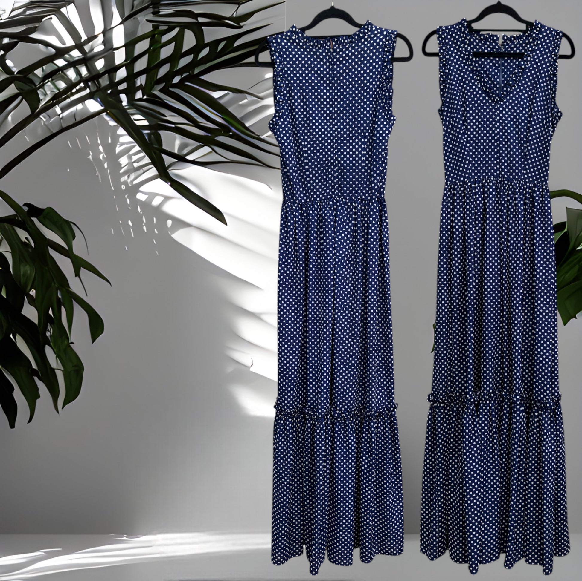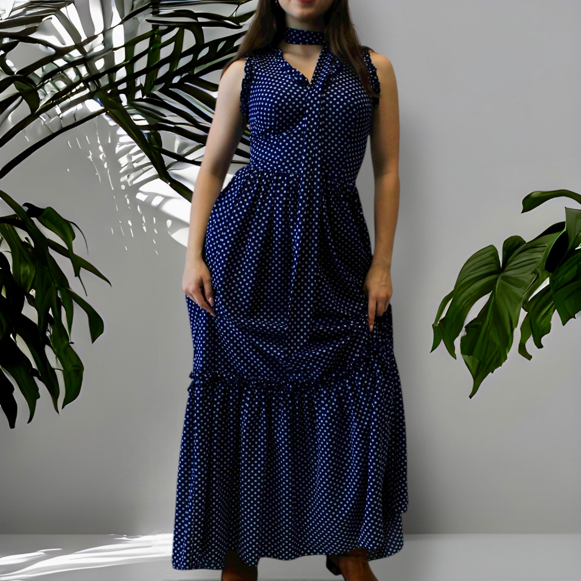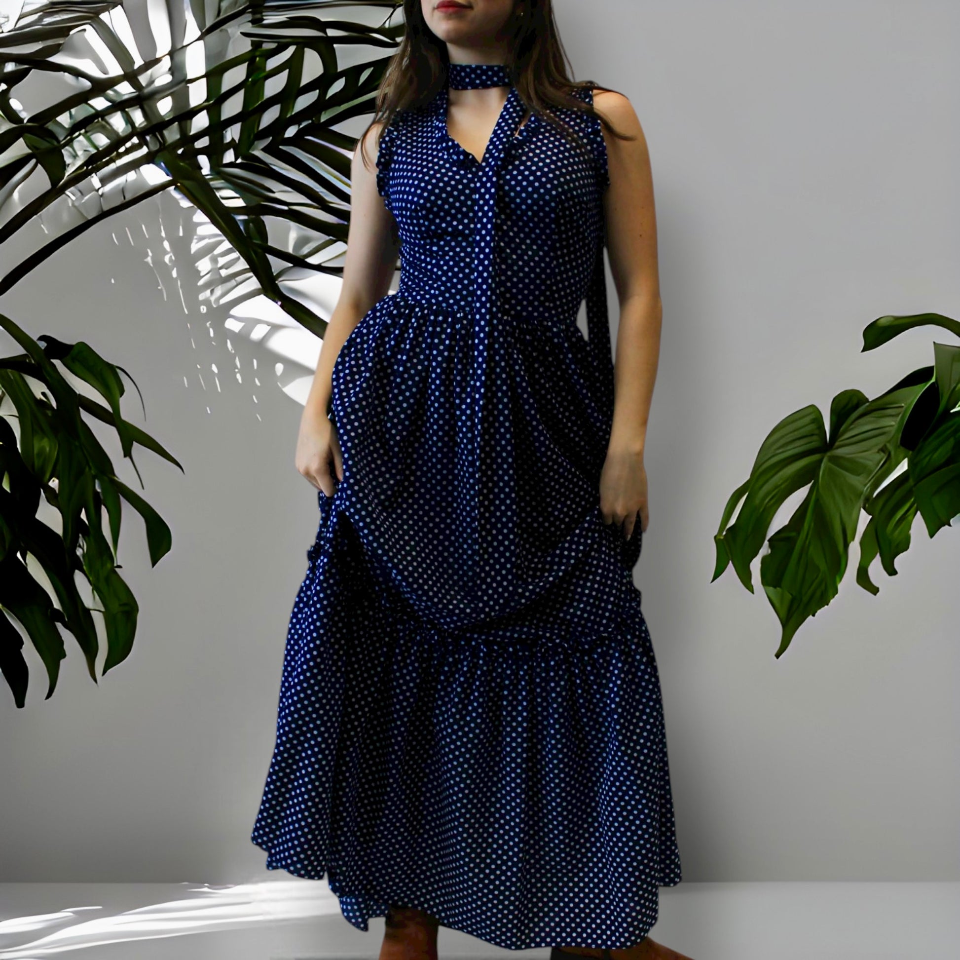 This 70s inspired, sleeveless, navy blue maxi dress features a white polka dot print. With a fitted bodice that flows into a long, tiered skirt, creating a soft, feminine silhouette.