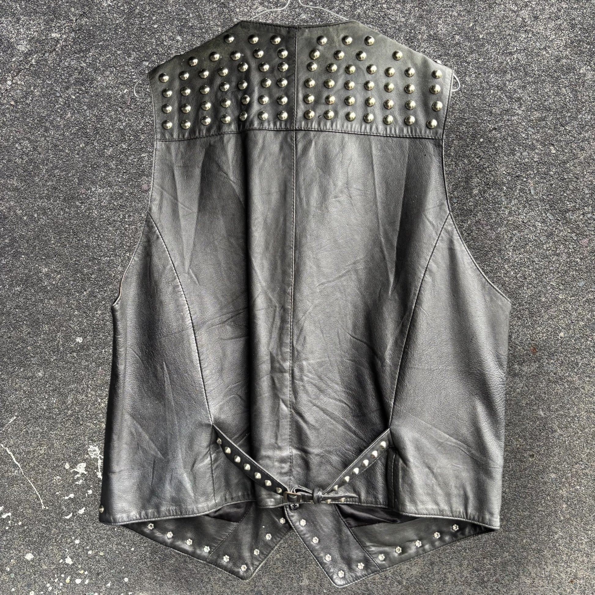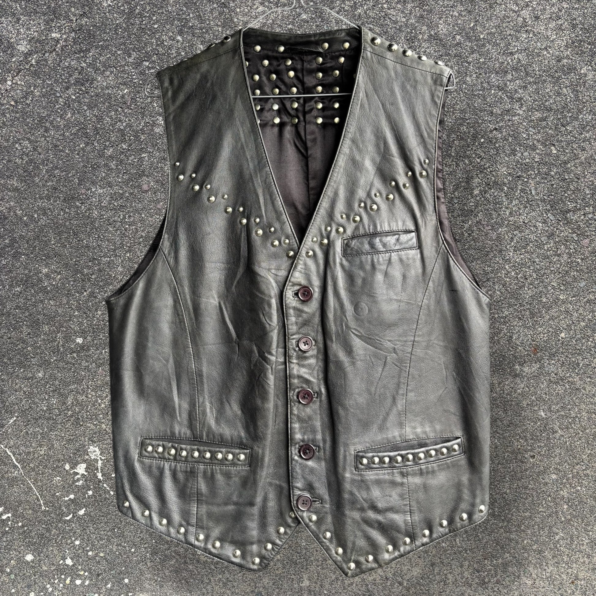 A super punk leather vest with stud detailing. Three pockets on the front, and an adjustable strap at the back to cinch in around the waist.