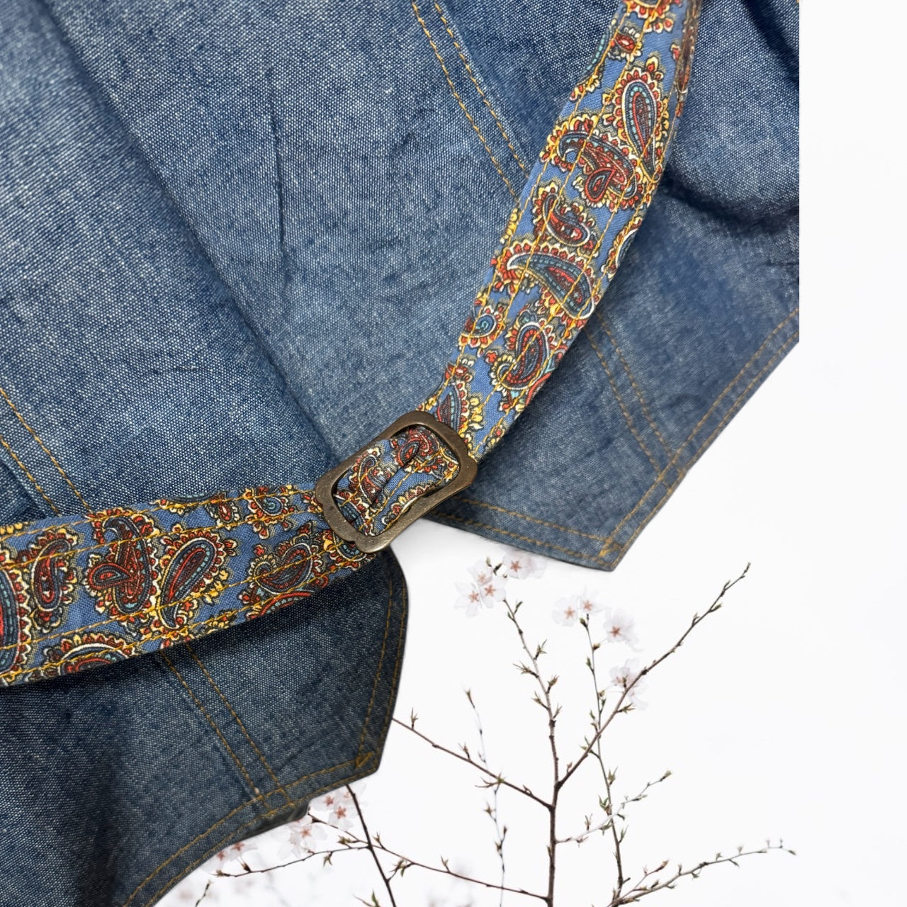 The back of the vest is made from a blue, denim like material featuring panelling for structure and shape, as well as an adjustable strap allowing for a custom fit