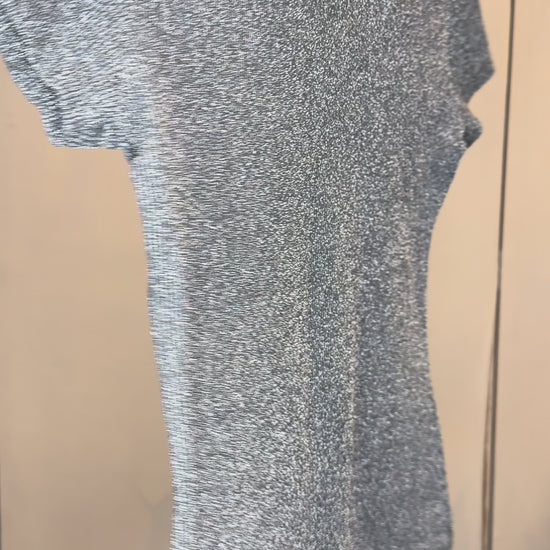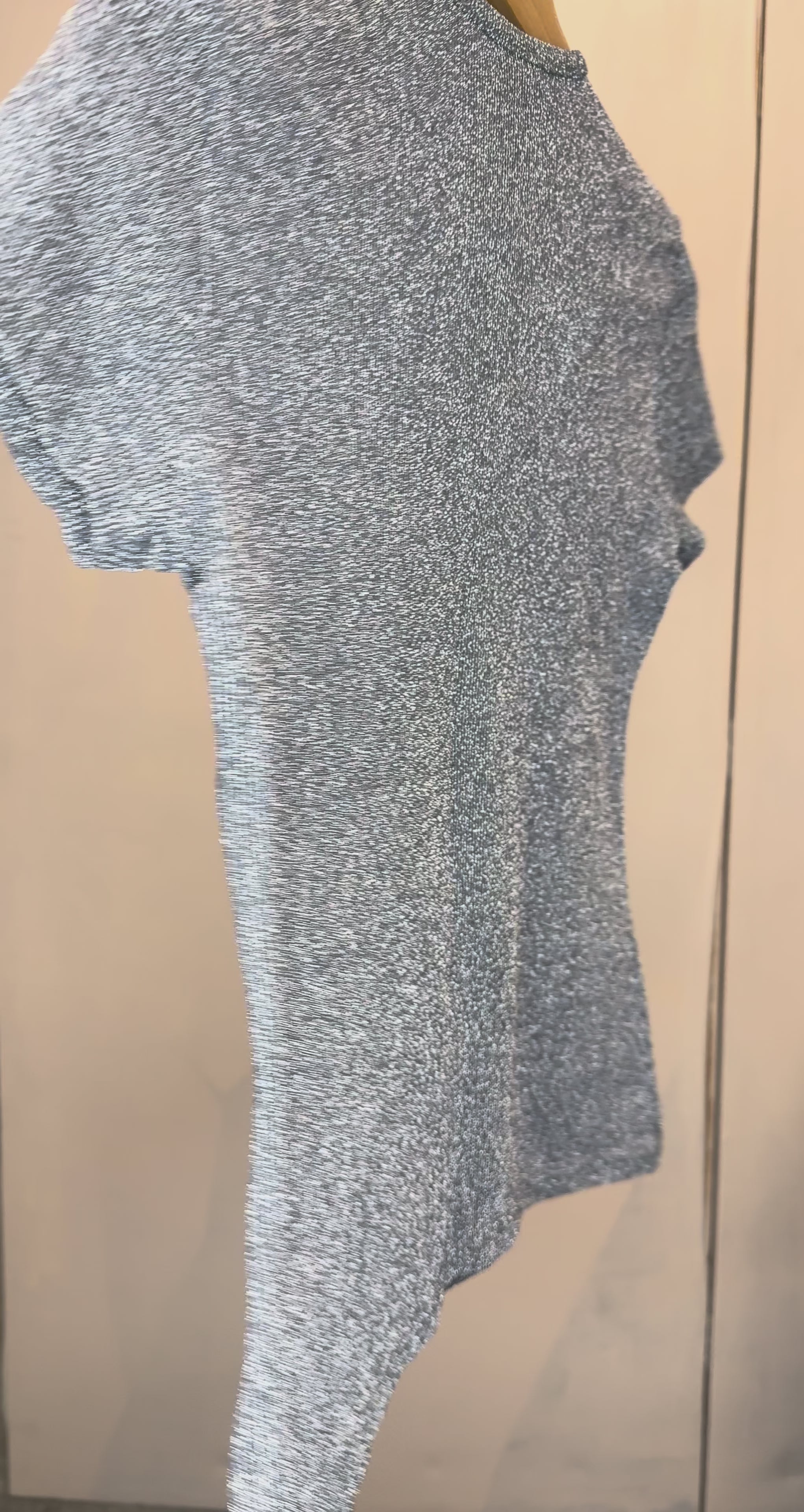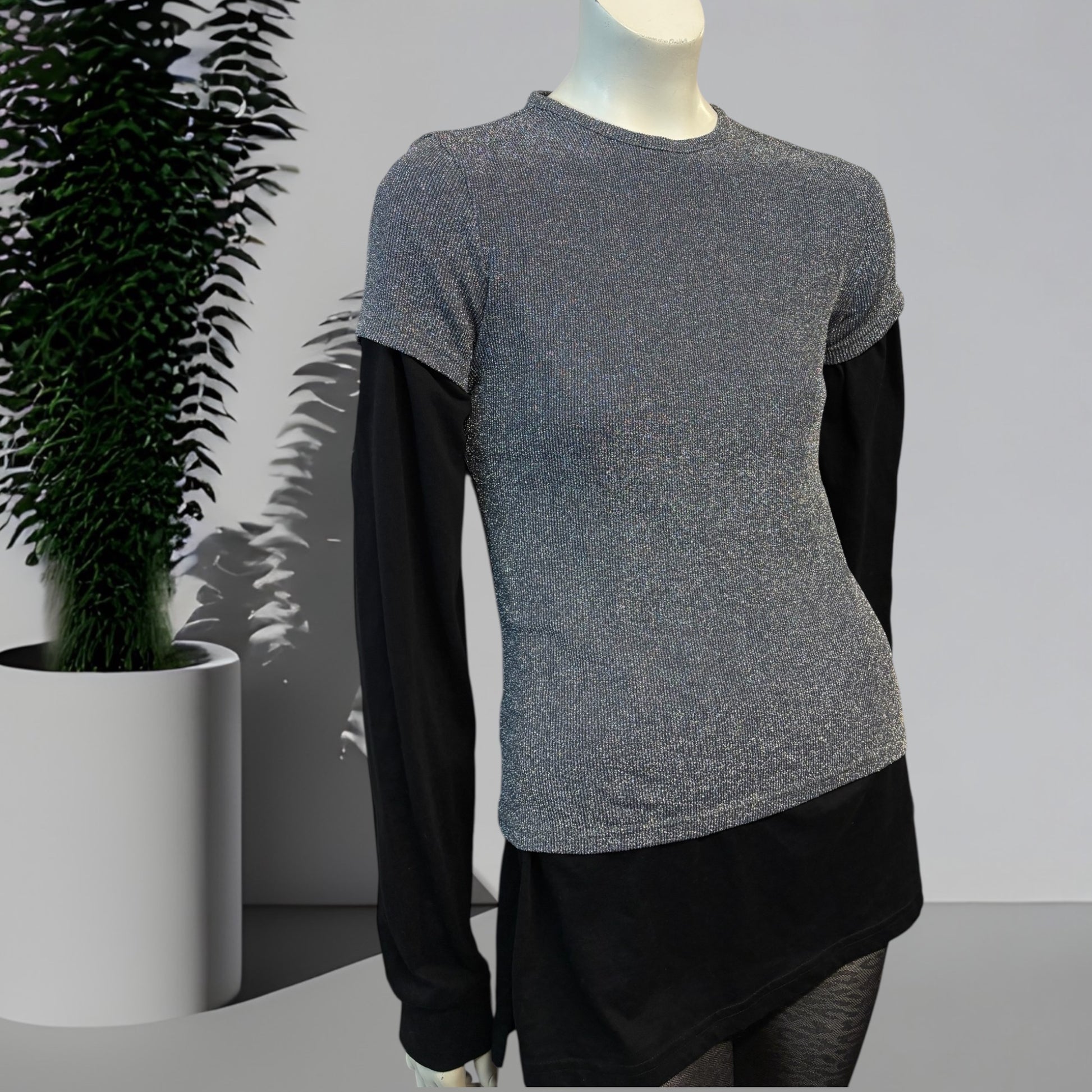 Close fitted 90’s Keith Matheson long line tee/top in a dark silver Lurex with stretch.