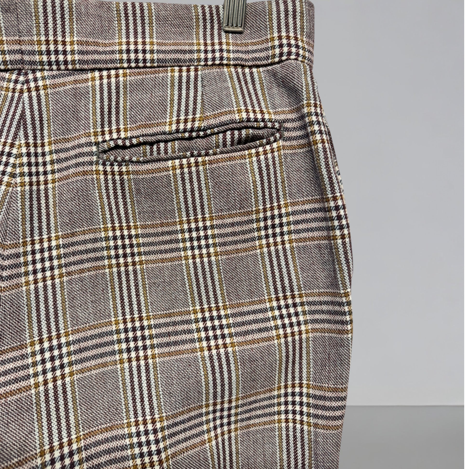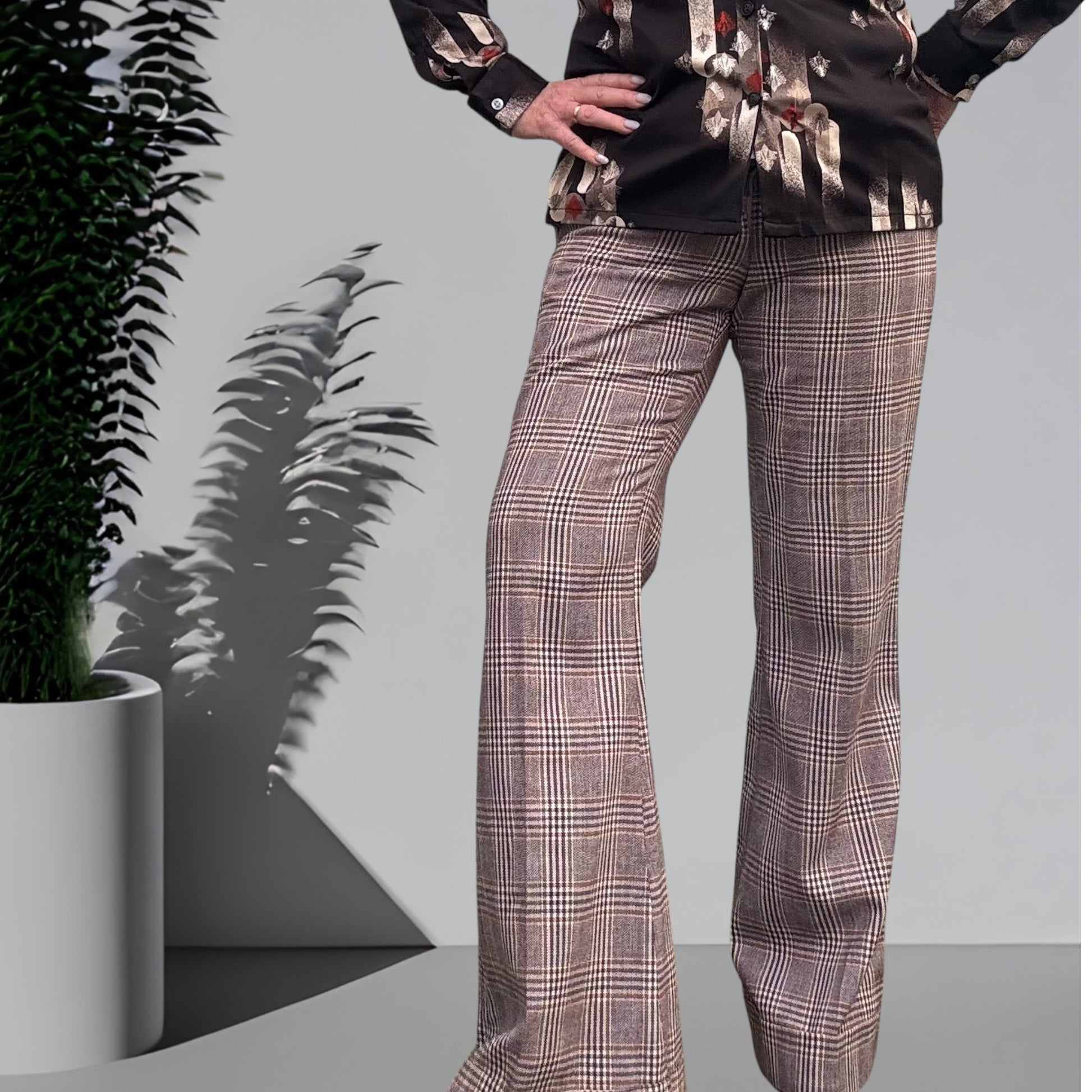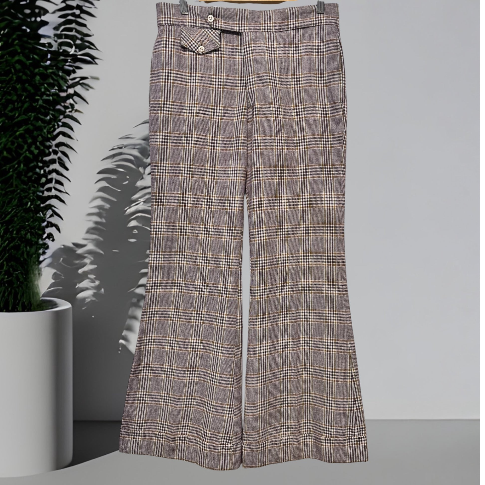 These high waisted, 70’s super flared trousers are featured in a classic checkered pattern in warm, sultry tones. With a button-tab accent, decorative flap pocket, and cuffed bottoms.