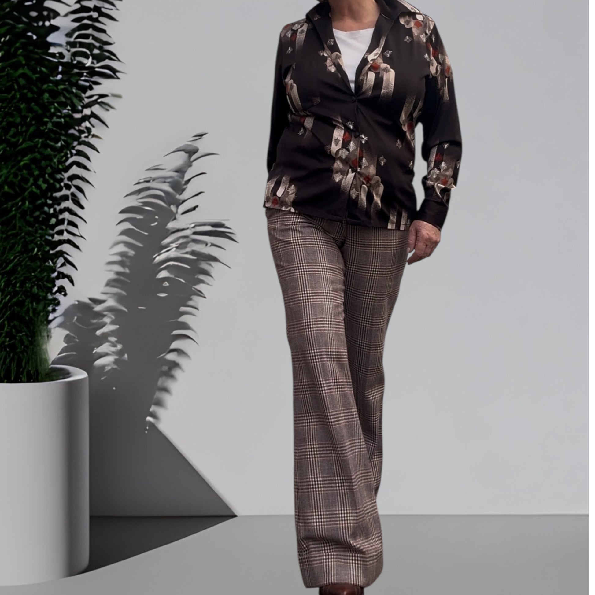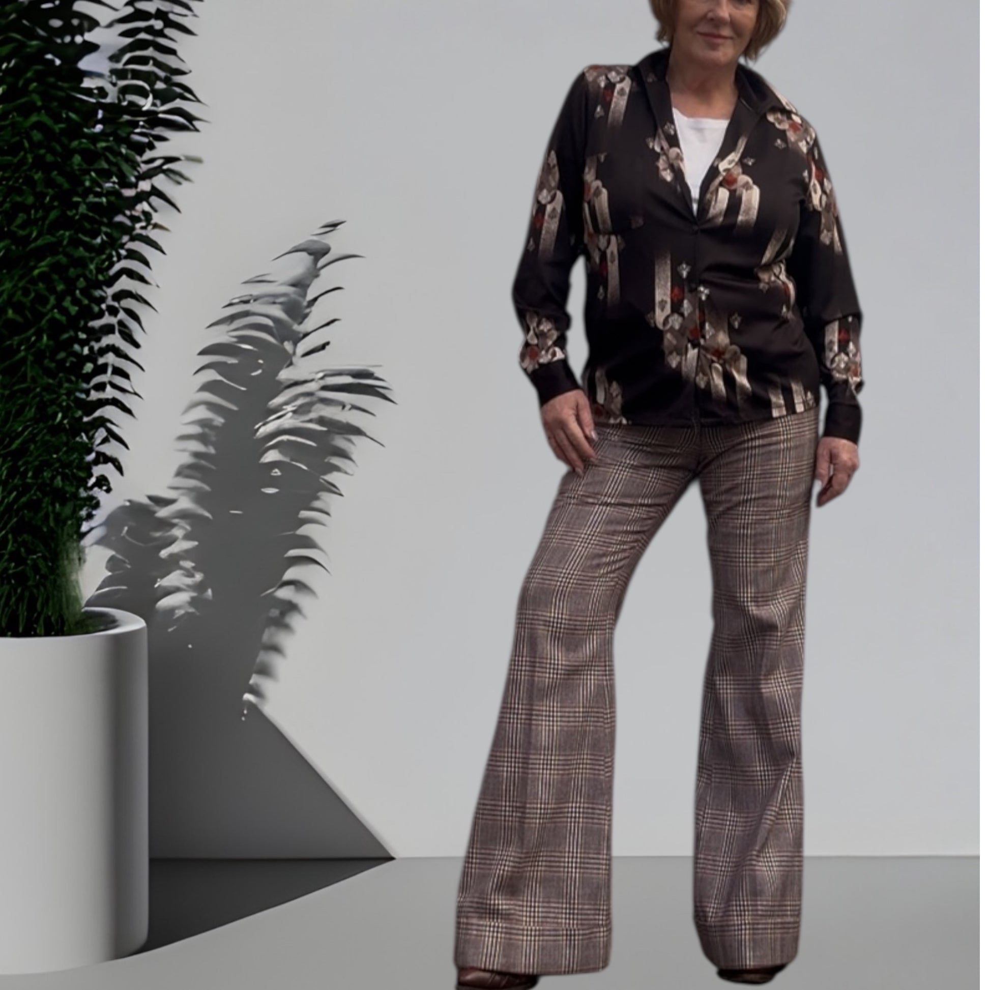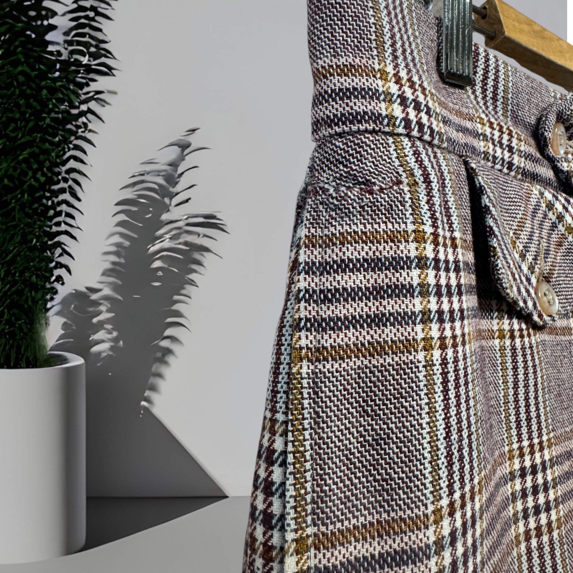 These high waisted, 70’s super flared trousers are featured in a classic checkered pattern in warm, sultry tones. With a button-tab accent, decorative flap pocket, and cuffed bottoms.