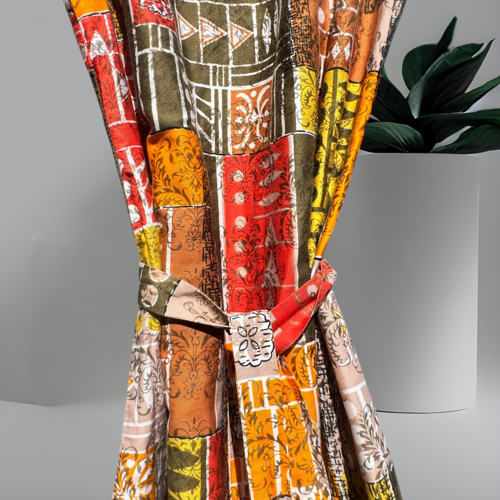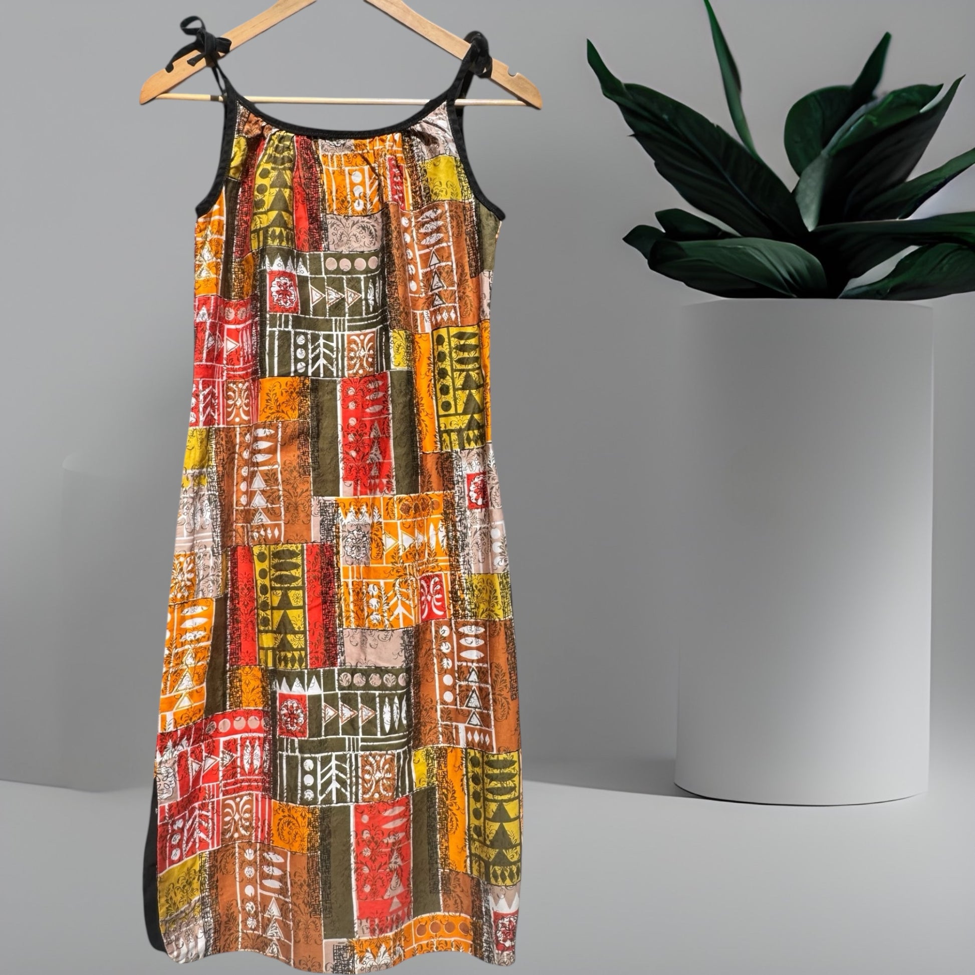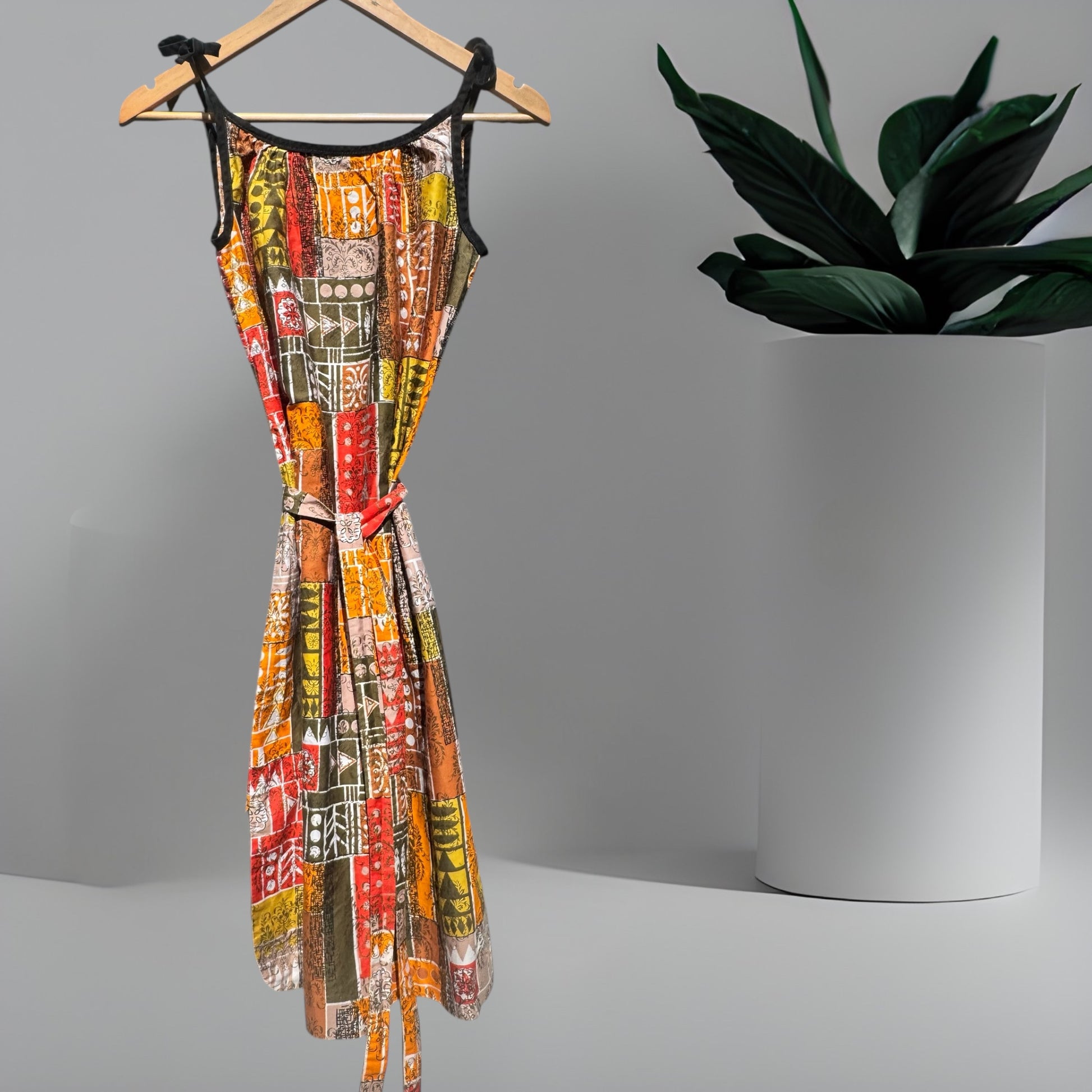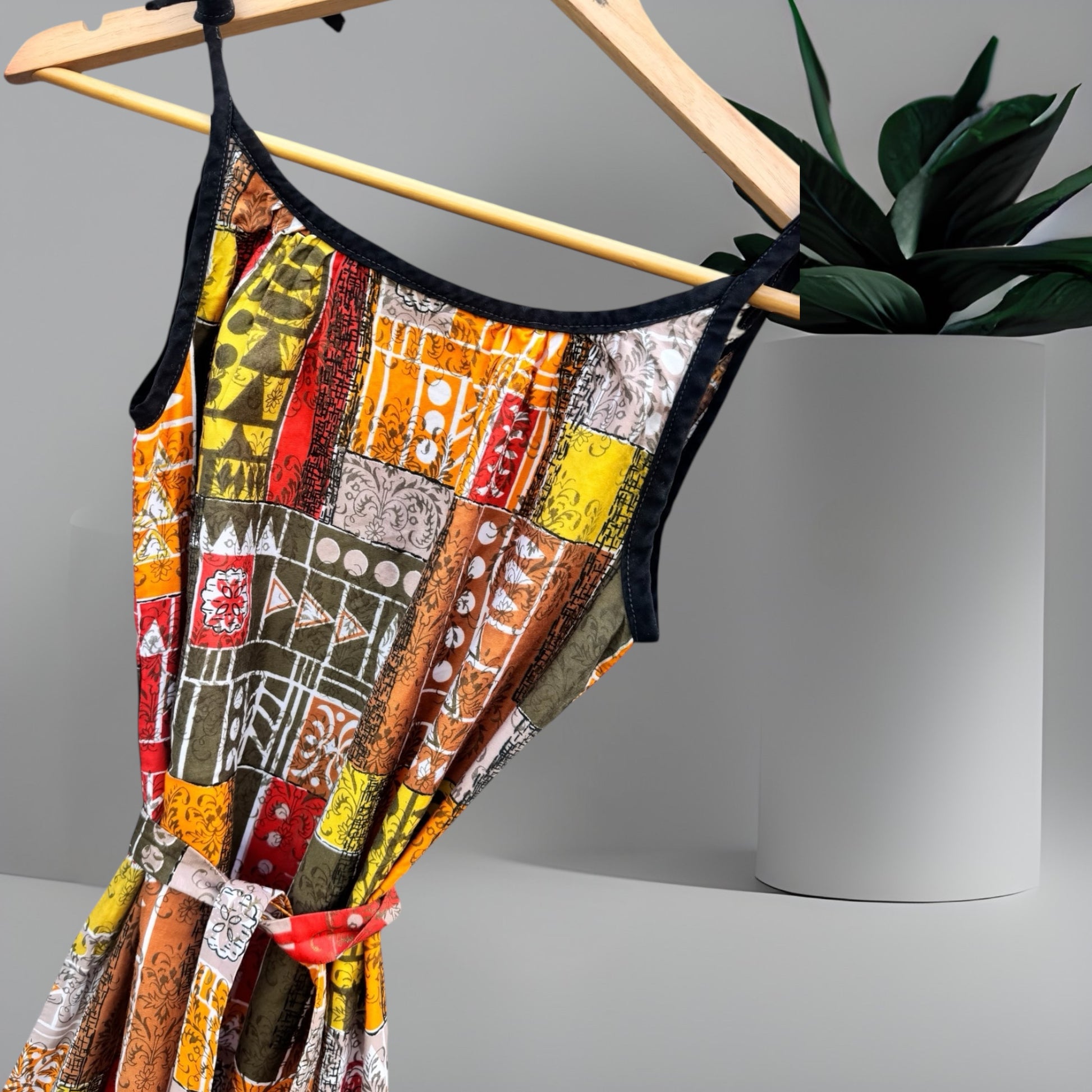 A multi print patch work style cotton fabric is the main drawcard on this otherwise simple vintage 60’s / 70’s sun dress.