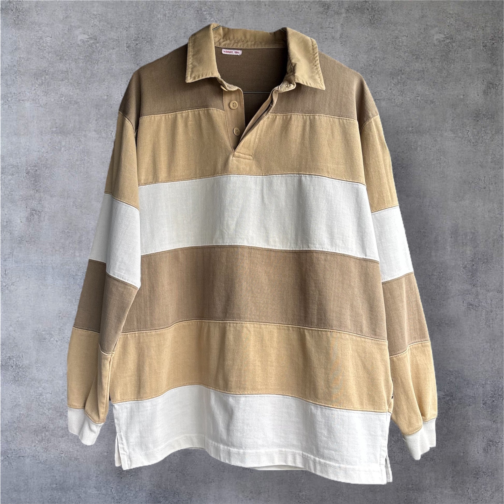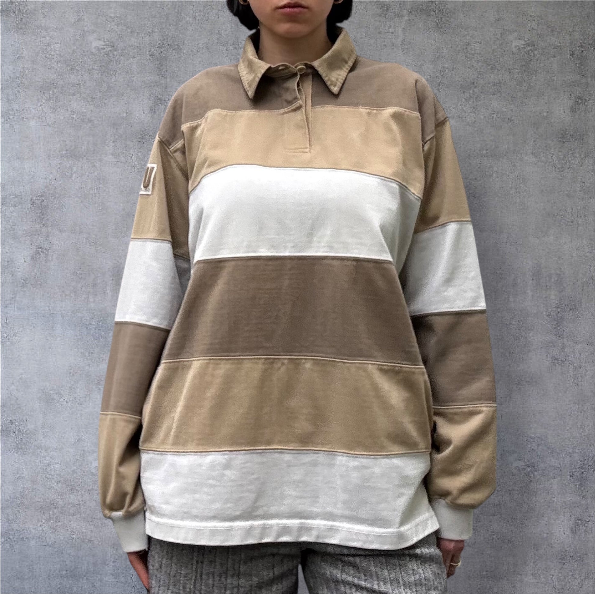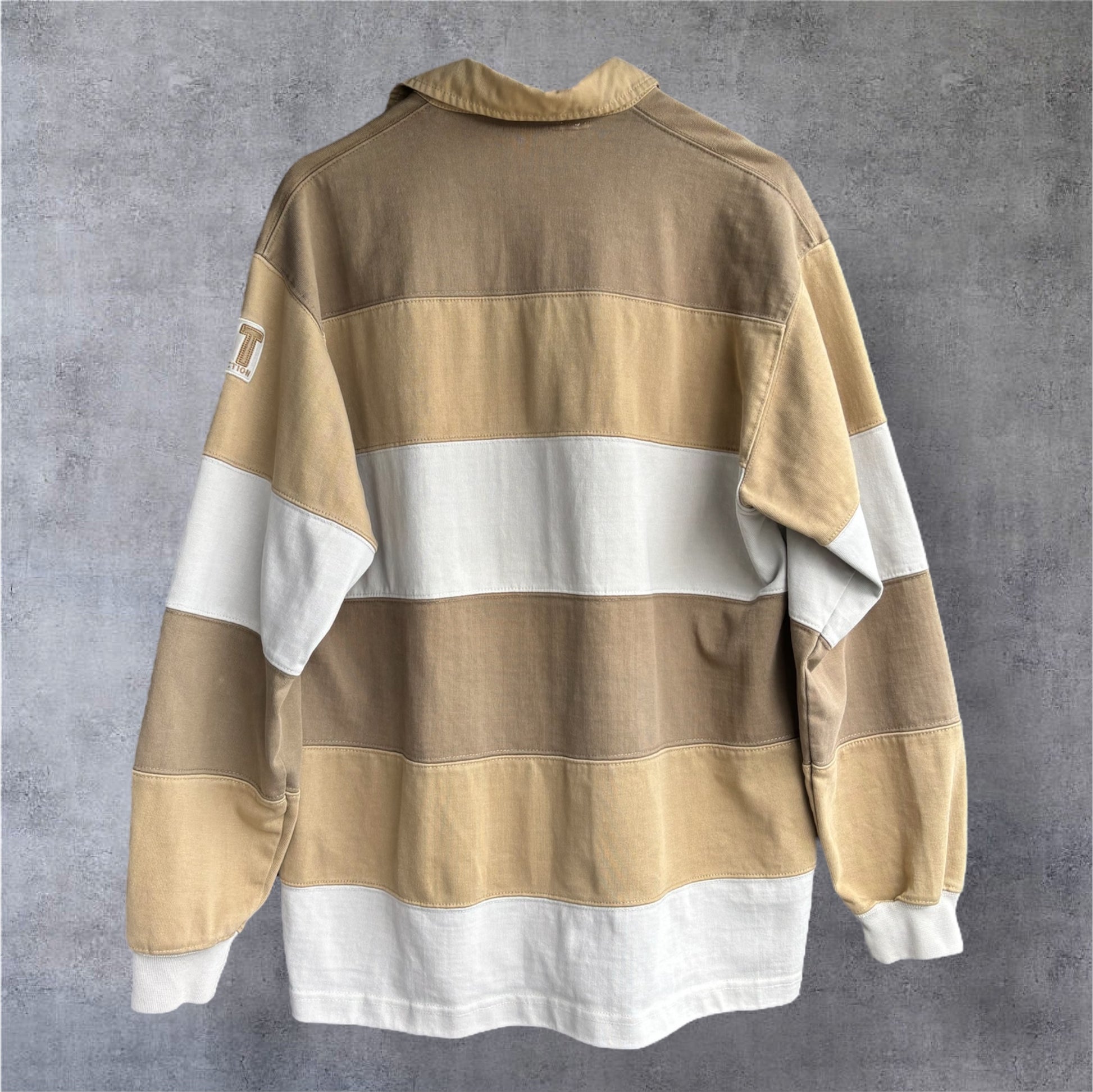 This United Trade Collection rugby jersey features wide horizontal stripes in warm, earthy tones of beige, tan and light brown.